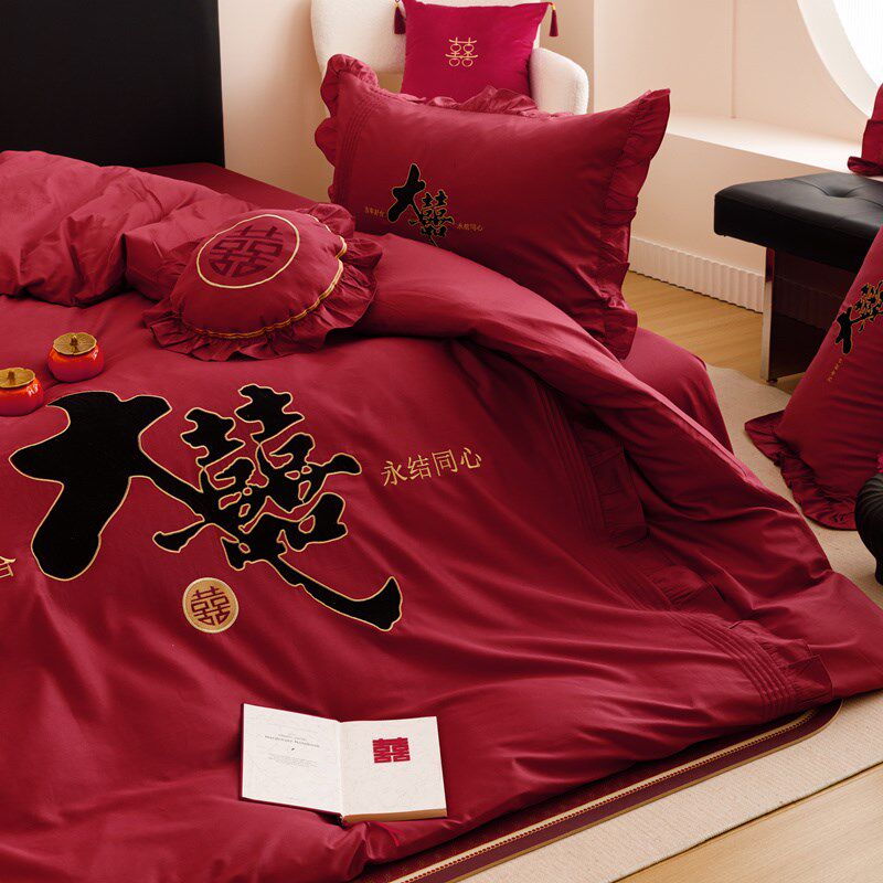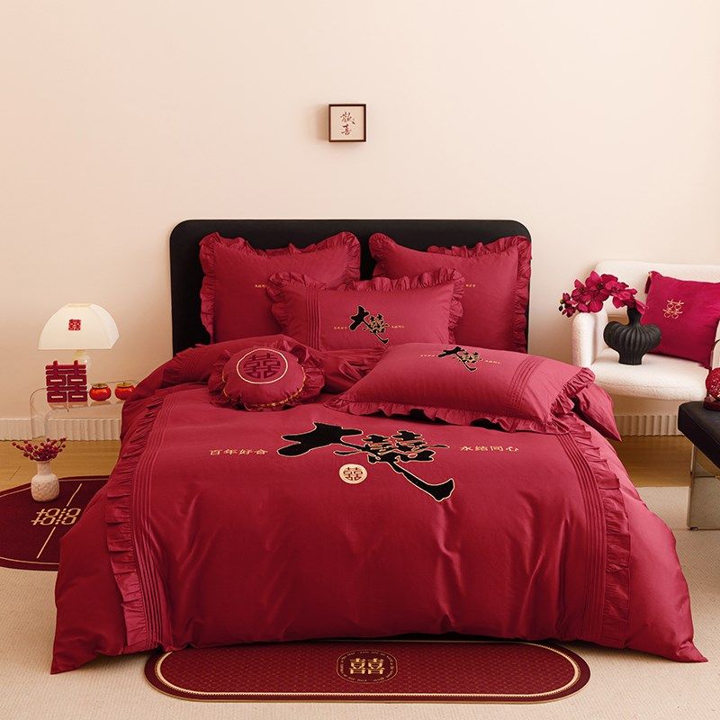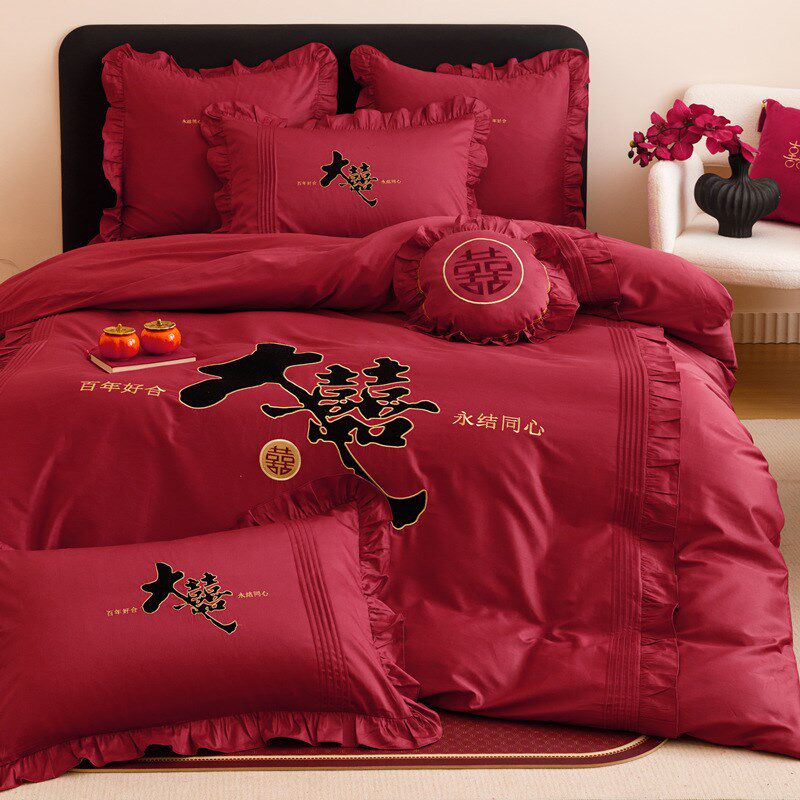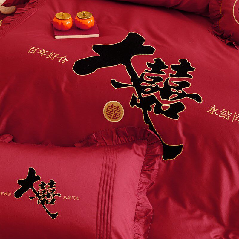 新中式红色长绒棉结婚四件套喜庆刺绣新婚庆被套床单床上用品