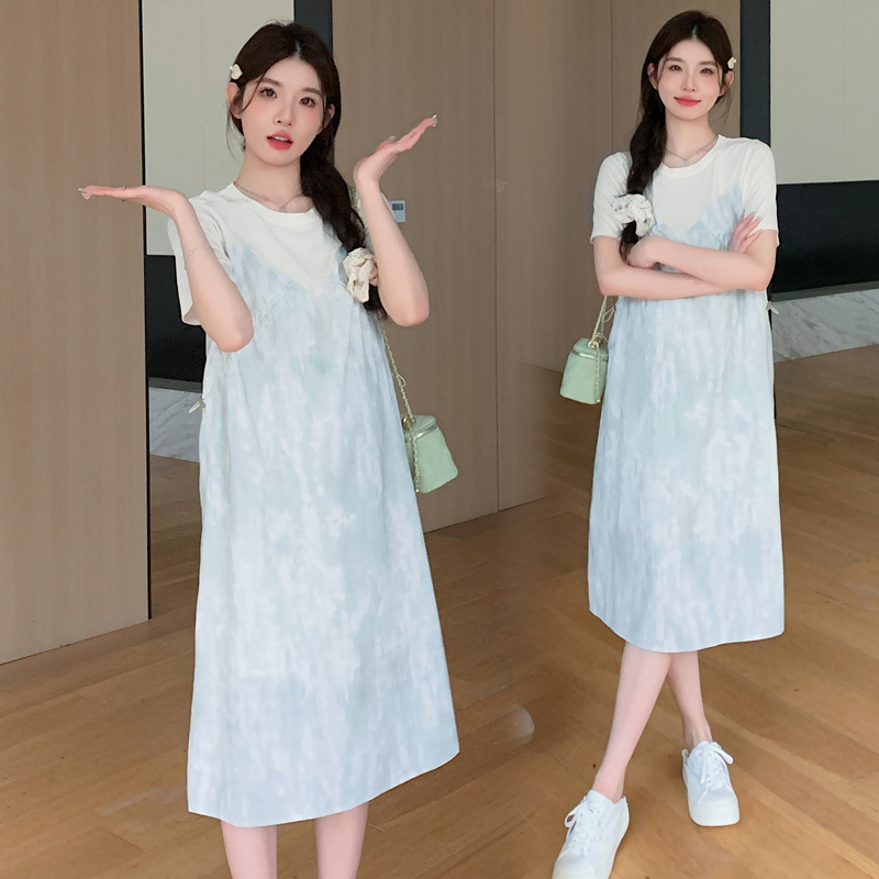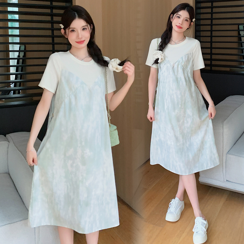孕妇连衣裙2025新款夏季短袖薄款时尚宽松显瘦拼接假两件中长款女