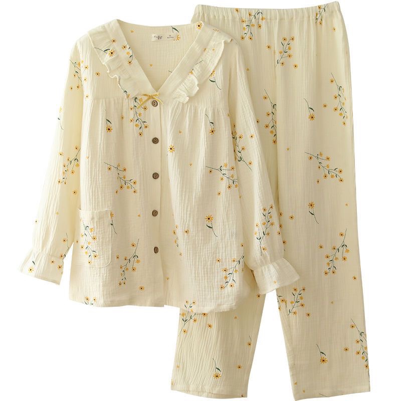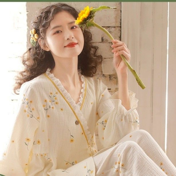 日系甜美纯棉睡衣春夏V领和服睡衣女士春秋长袖月子服家居服套装