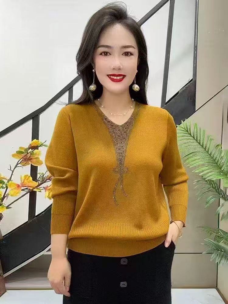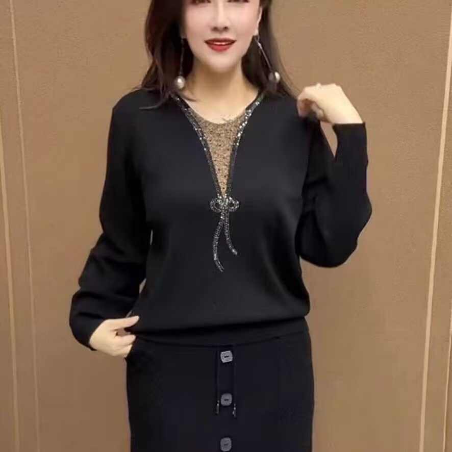 2025春秋新款时尚洋气烫钻针织衫女宽松显瘦百搭妈妈装长袖打底衫