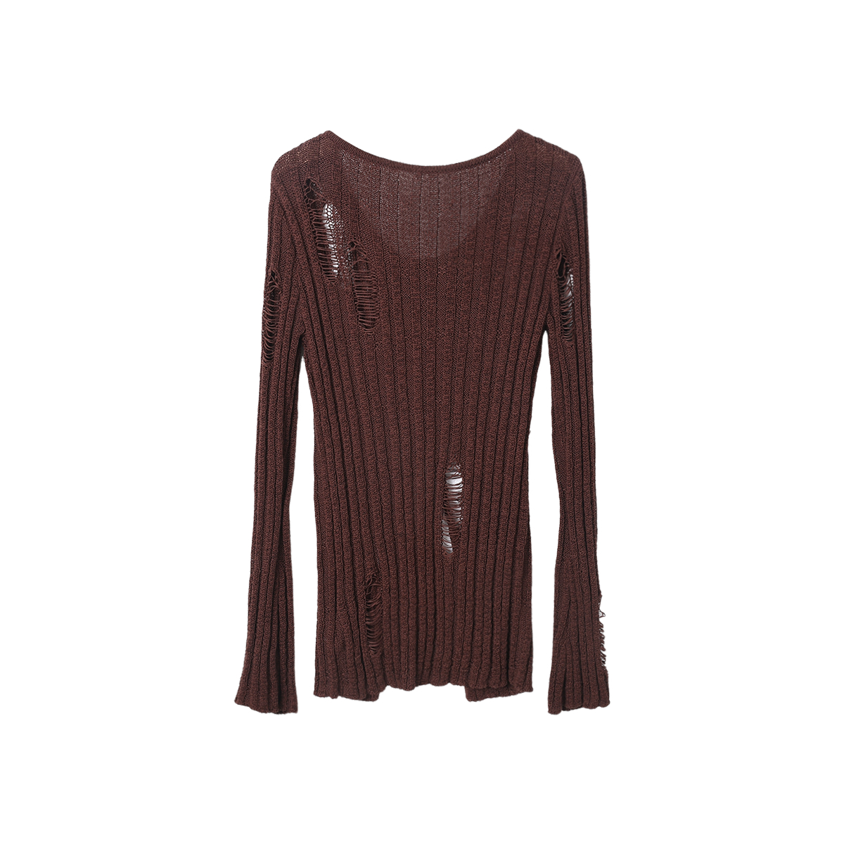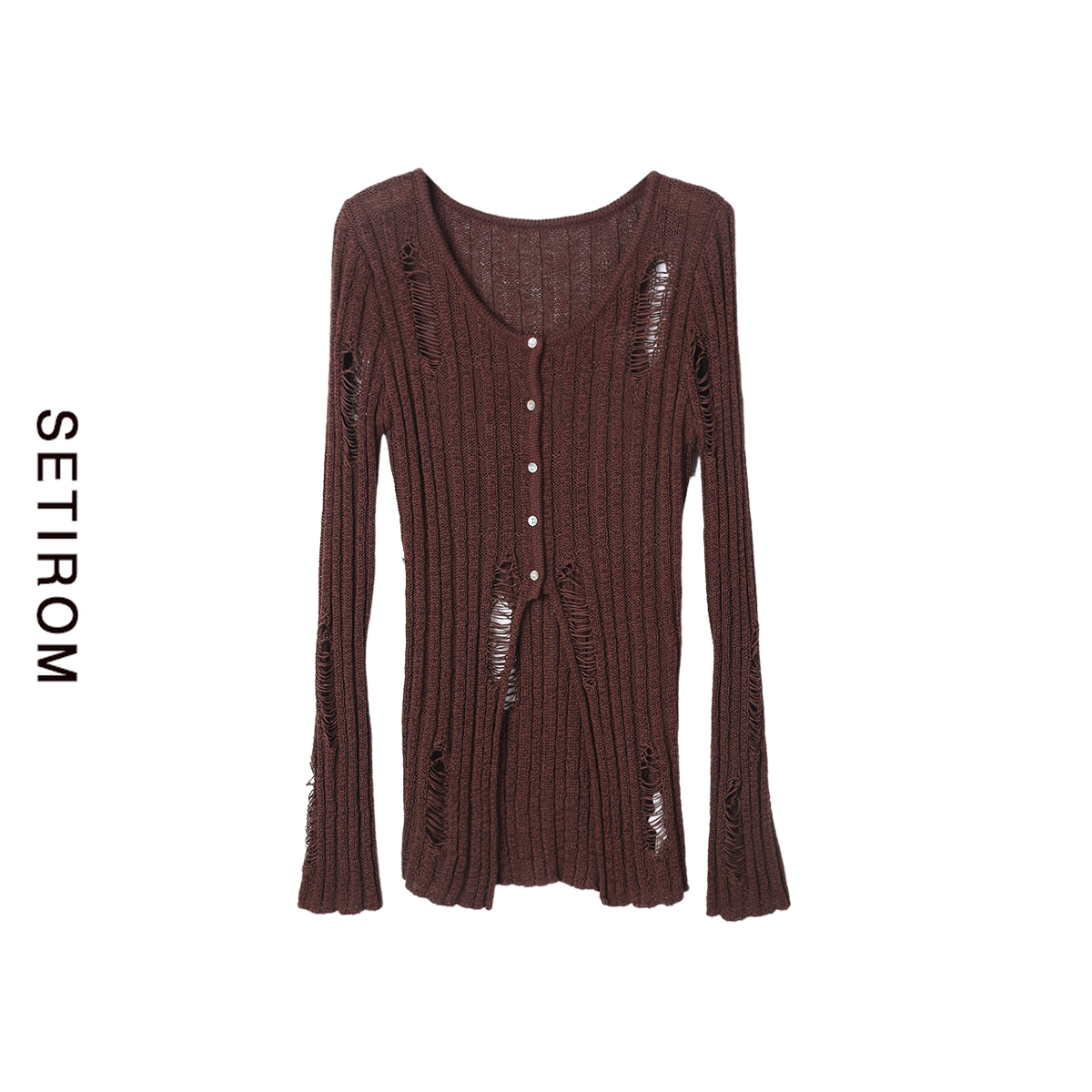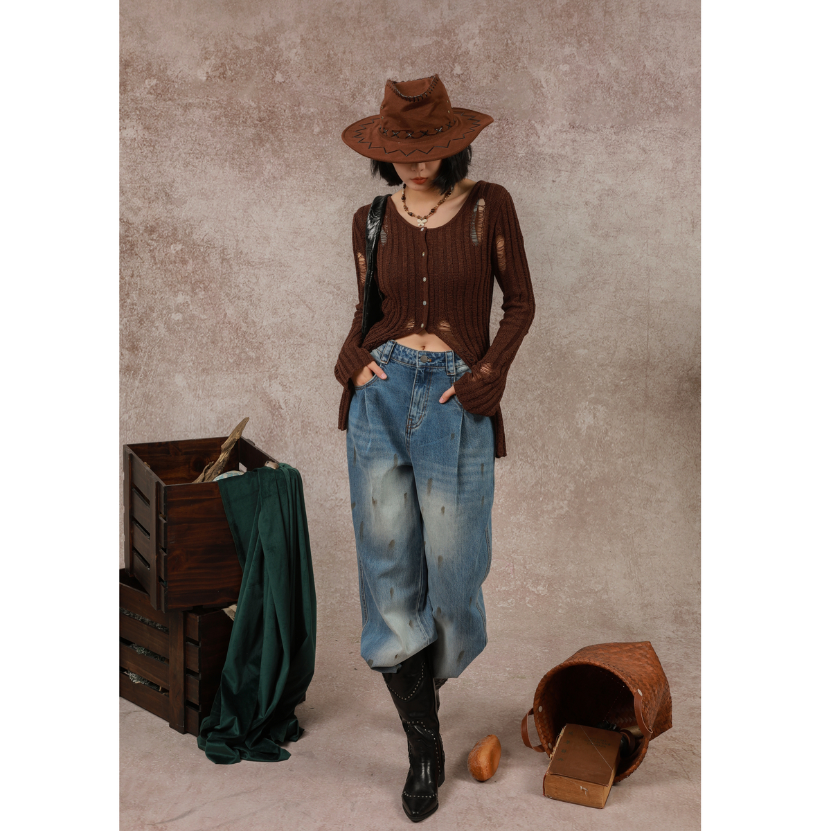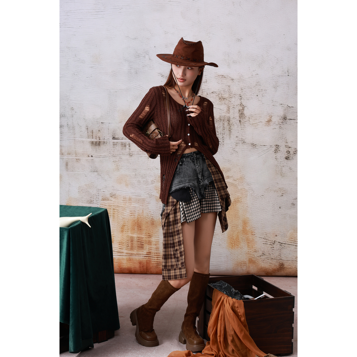 西町村屋流浪圆领中长款开衫女秋季新款复古修身针织衫XA9C10050