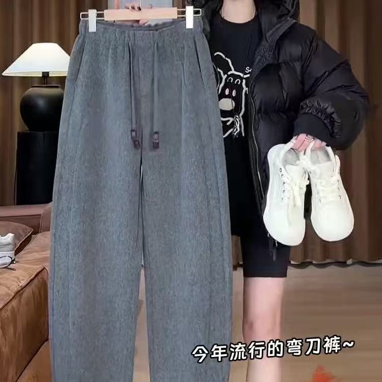 灰色加绒加厚休闲裤女秋冬新款大码松紧腰抽绳弯刀阔腿裤