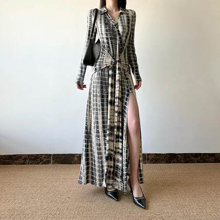 gagaopt设计感撞色绑带收腰长袖连衣裙女舒适宽松修身显瘦中长裙