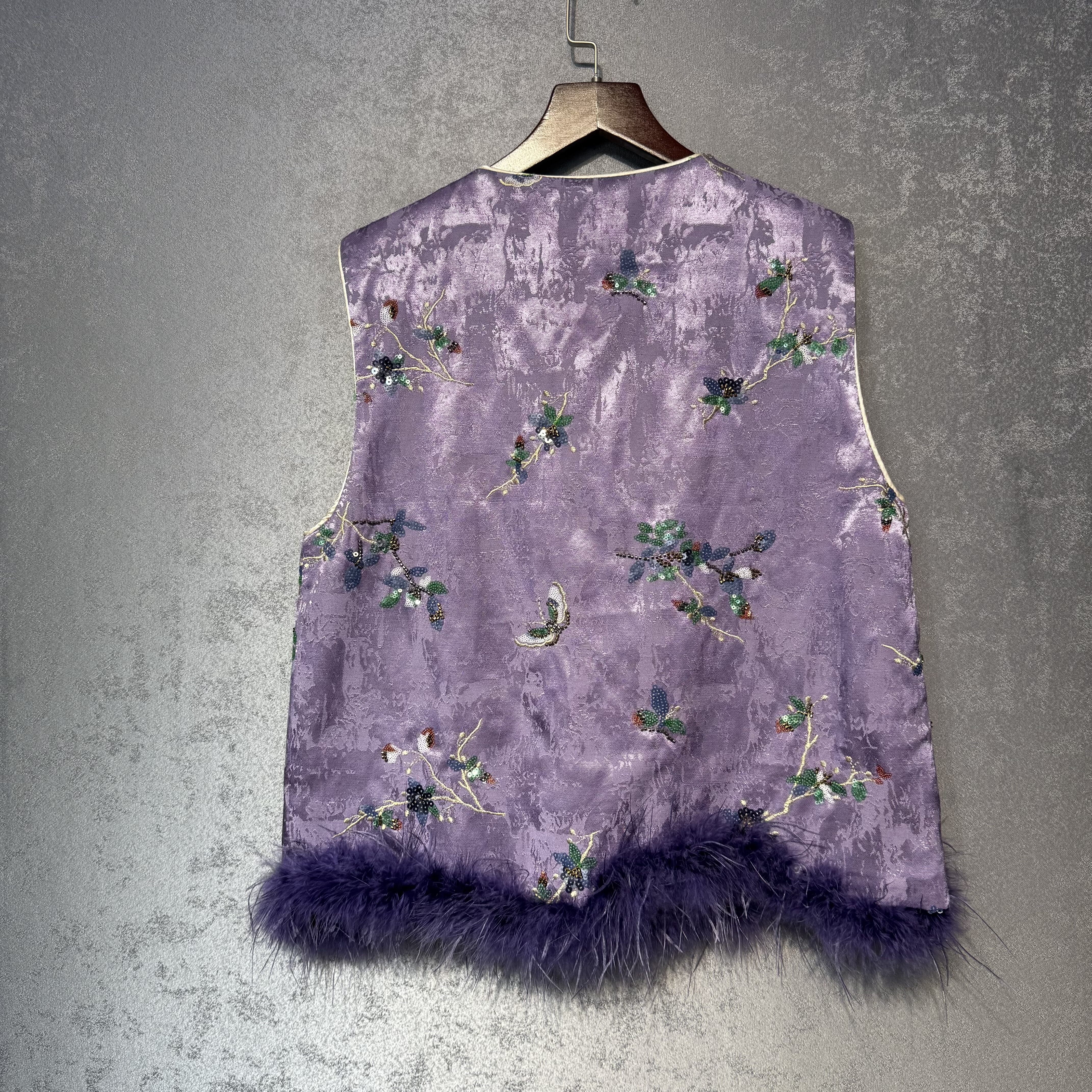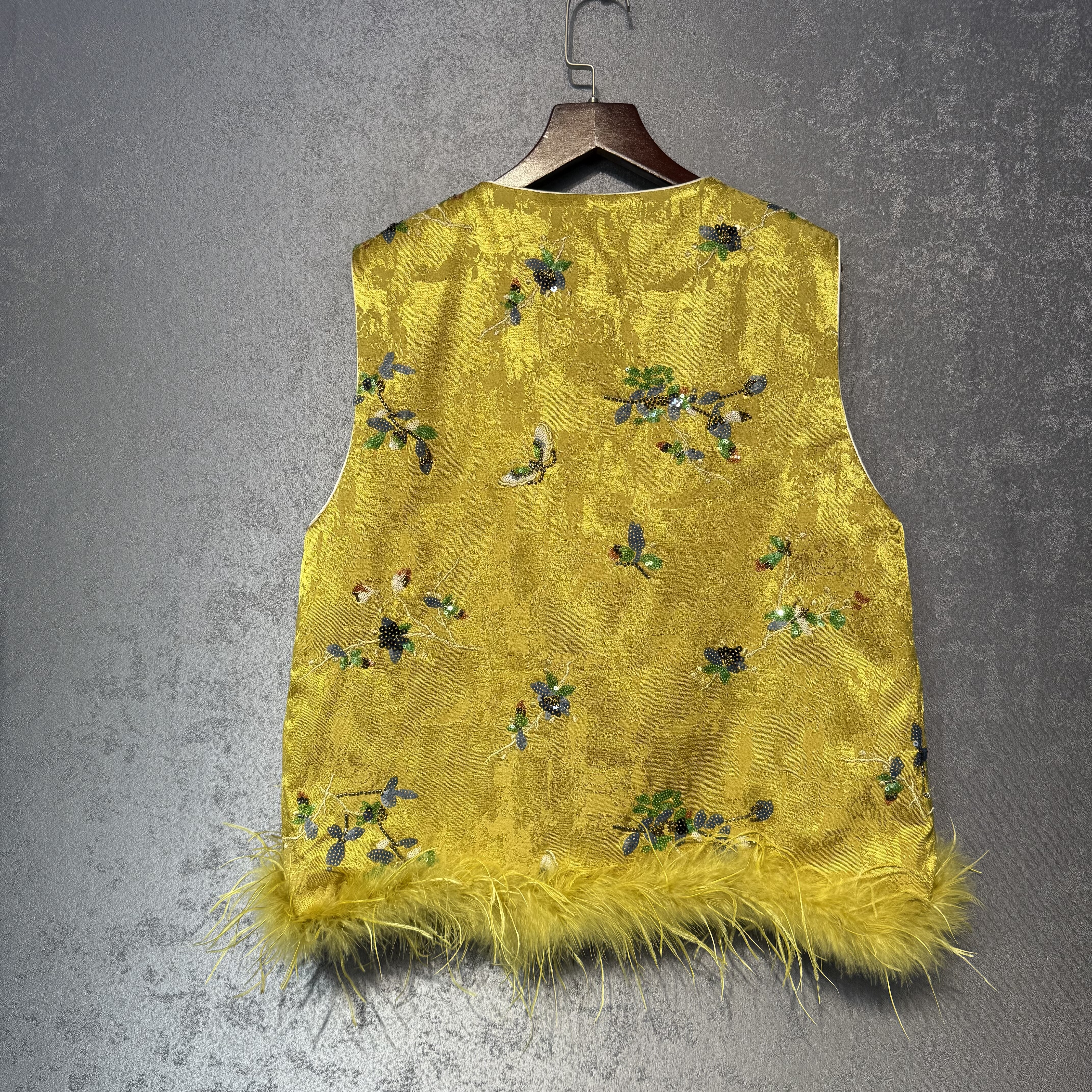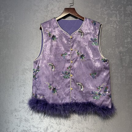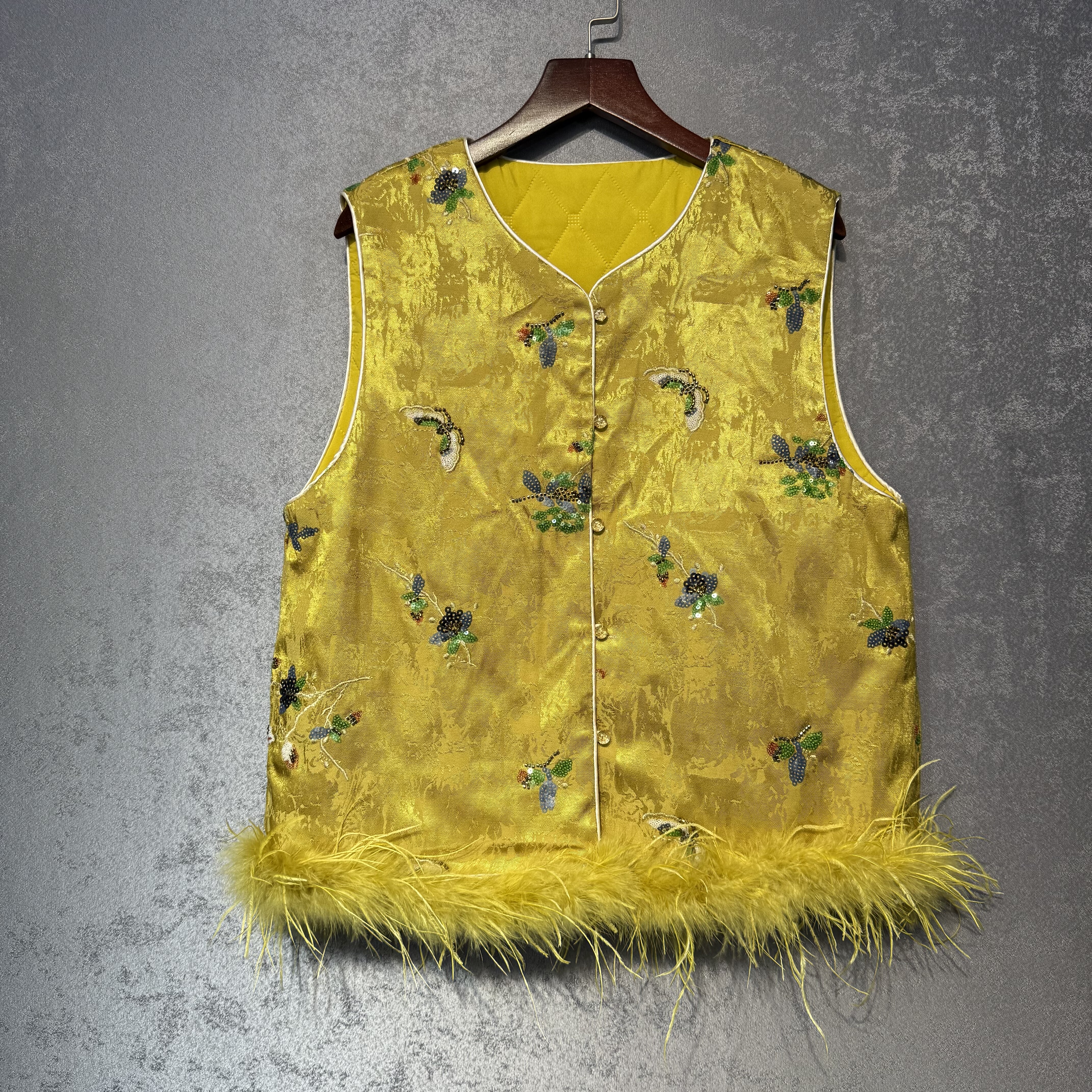 新中式国风马甲鸵鸟毛提花坎肩背心秋冬女款夹棉盘扣马夹无袖外搭