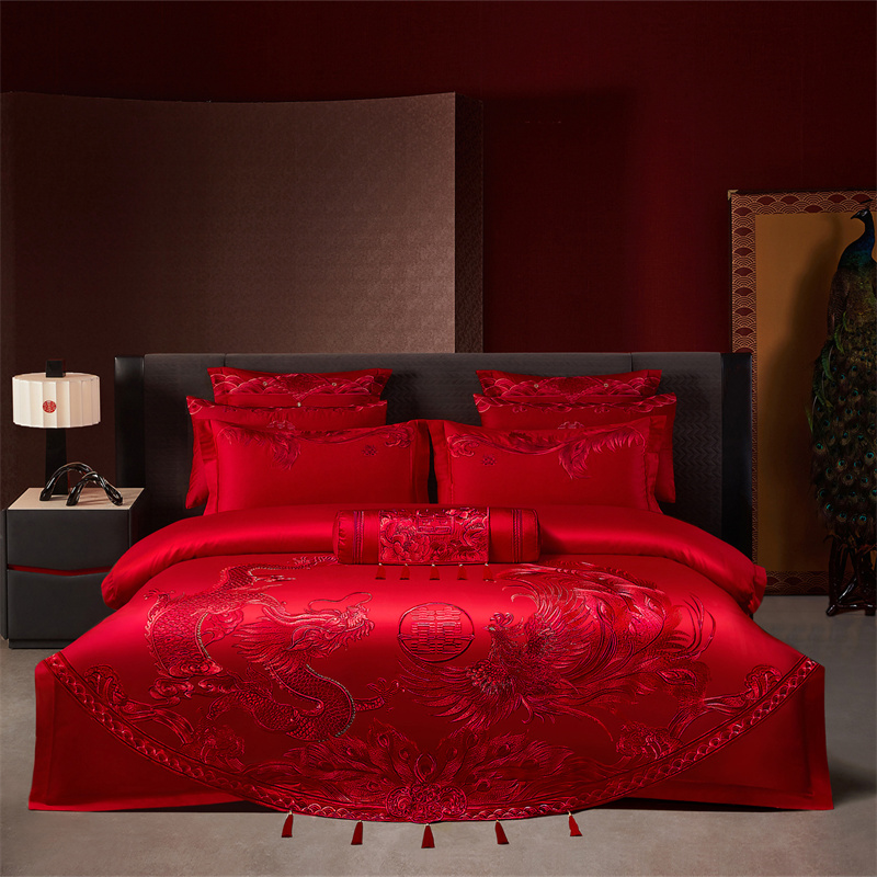 雅鹿家纺结婚全棉四件套纯棉刺绣婚庆大红陪嫁婚房喜被芯床上用品