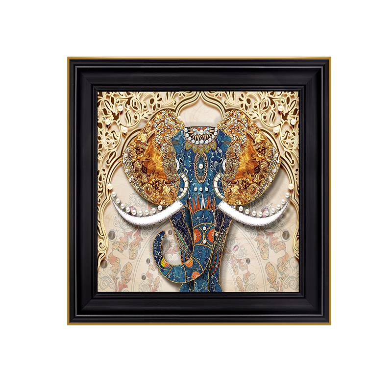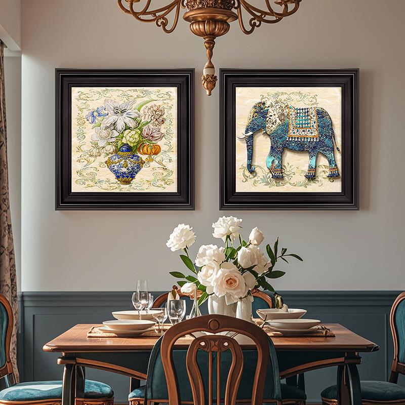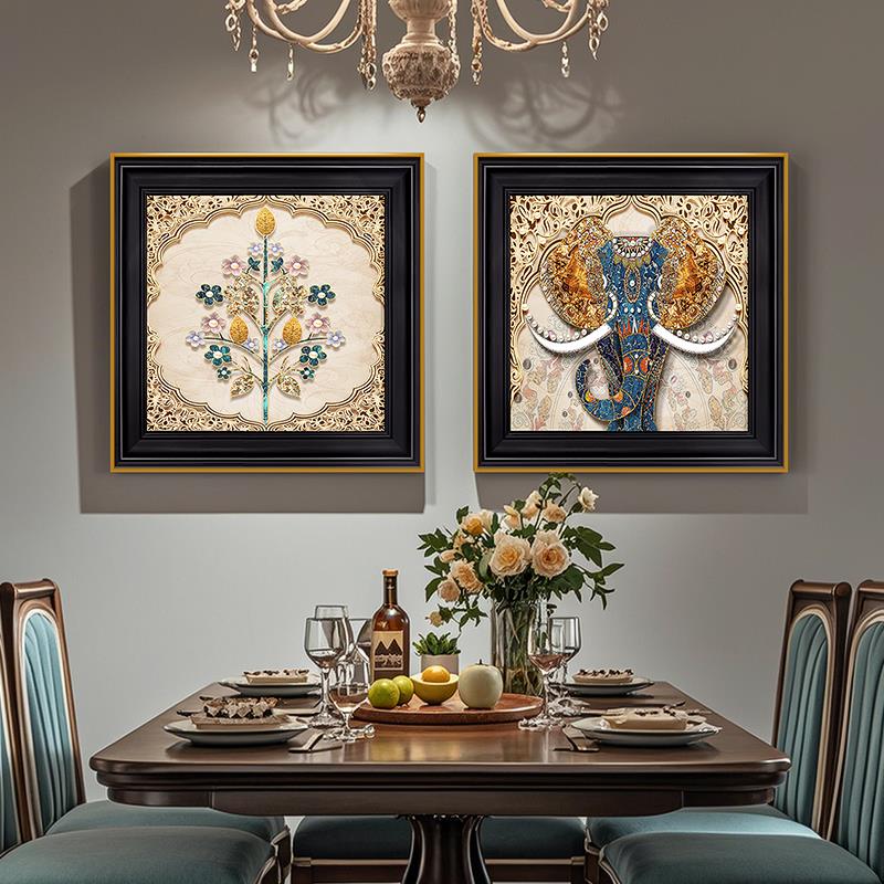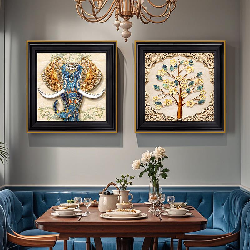 美式复古大象餐厅装饰画发财树饭厅二双联挂画欧式玄关正方形壁画