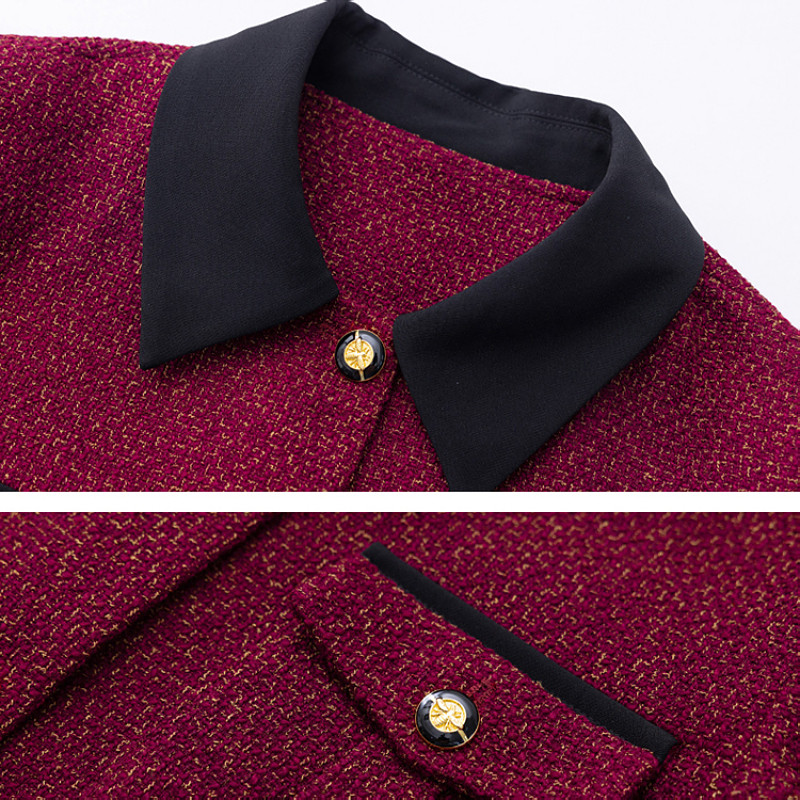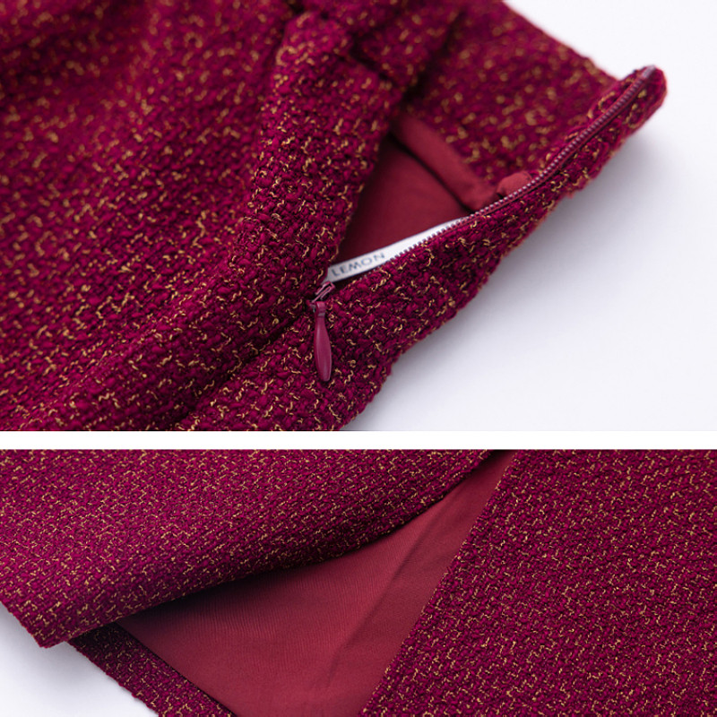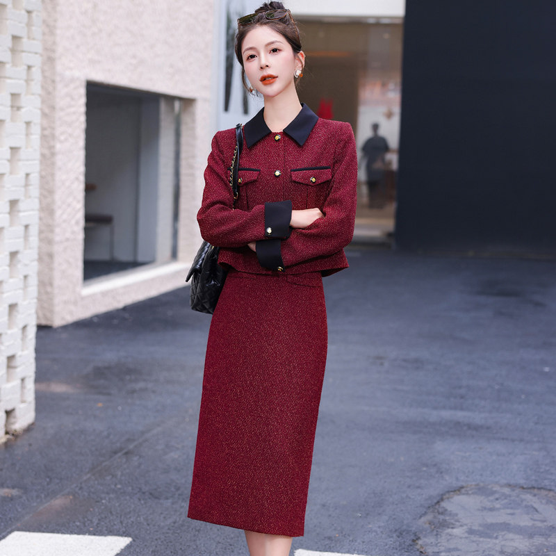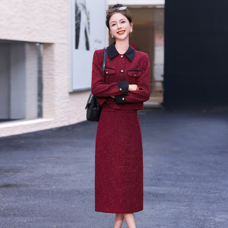 2025秋冬装新款粗花呢小香风套装气质显瘦外套半身裙两件套酒红色