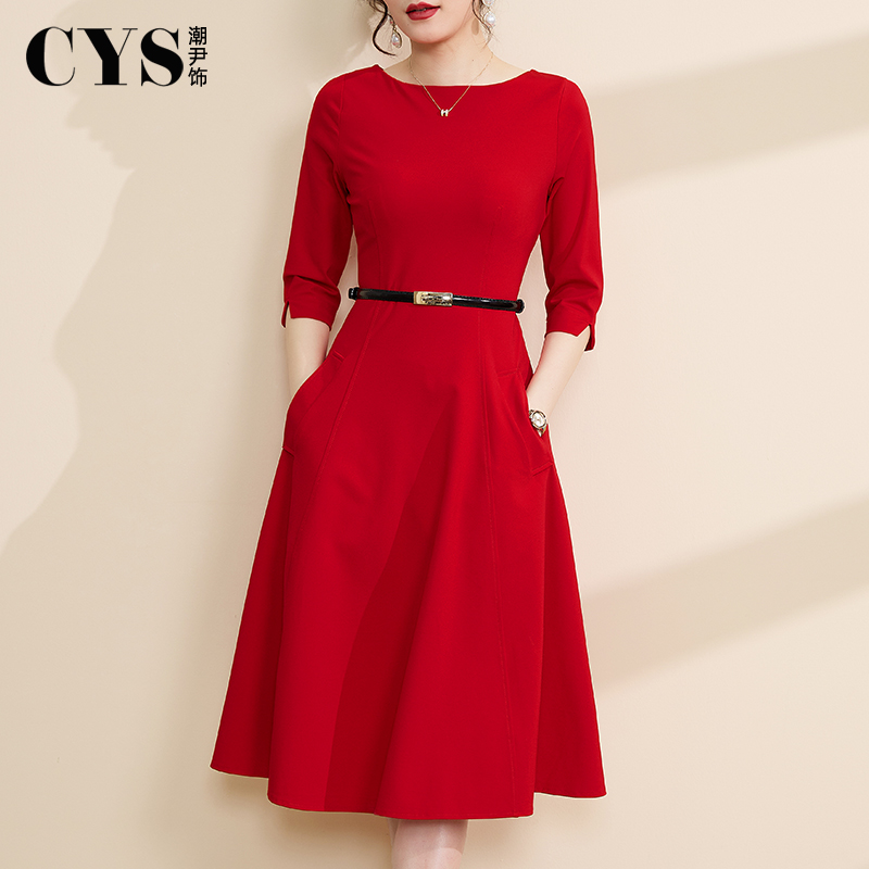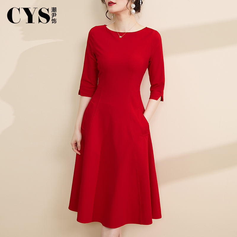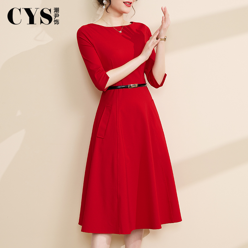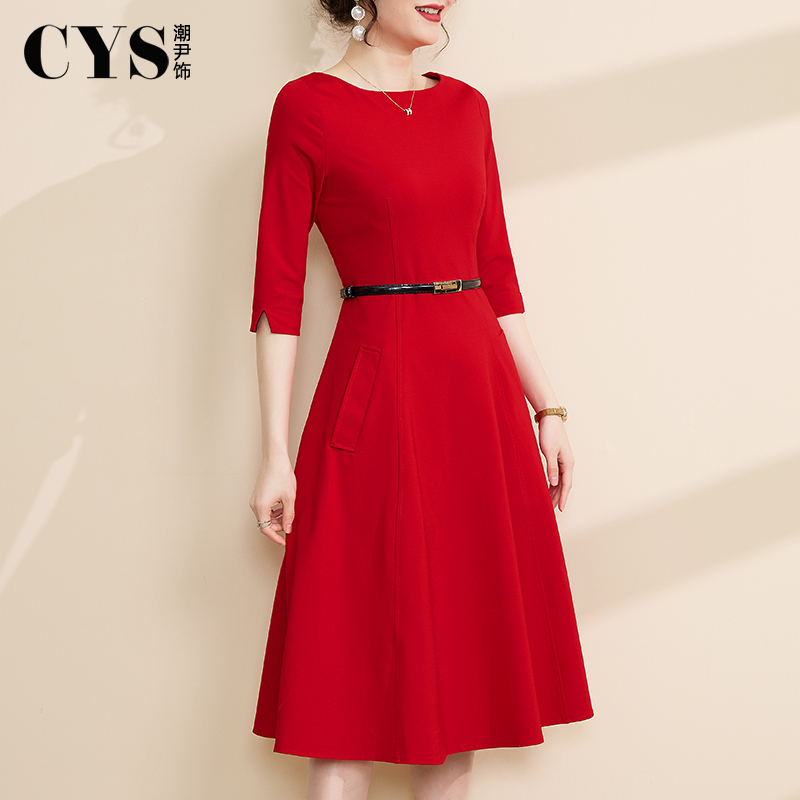 2025秋季新款轻奢高级感红色职业连衣裙女收腰显瘦气质赫本风裙子