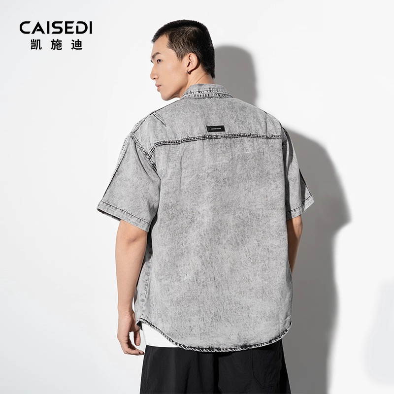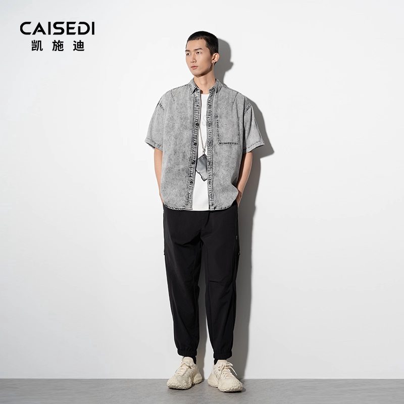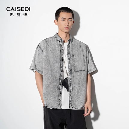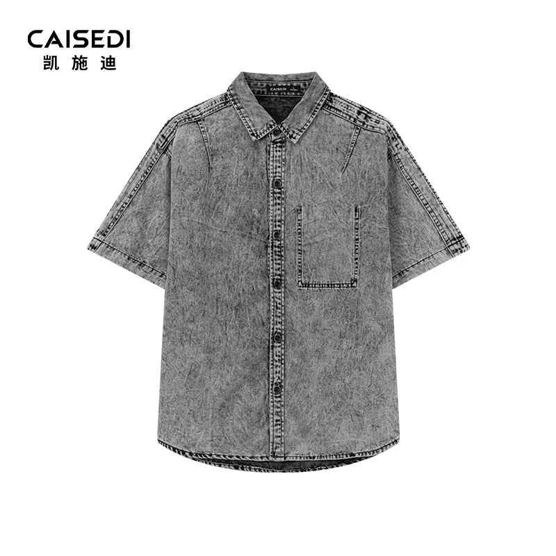 CAISEDI/凯施迪翻领短袖衬衫男士夏季宽松休闲舒适水洗牛仔半袖男