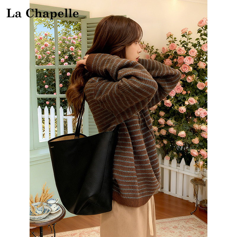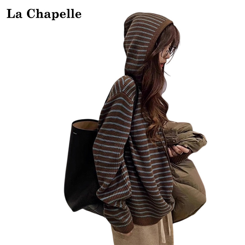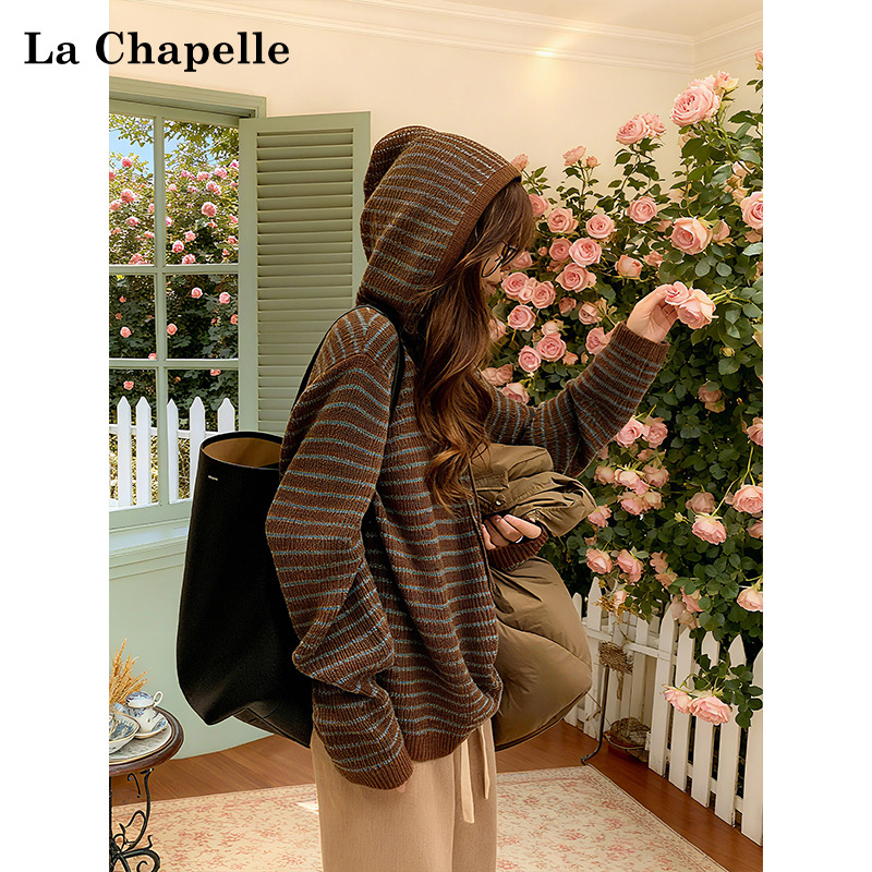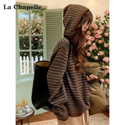 拉夏贝尔慵懒风条纹连帽毛衣外套