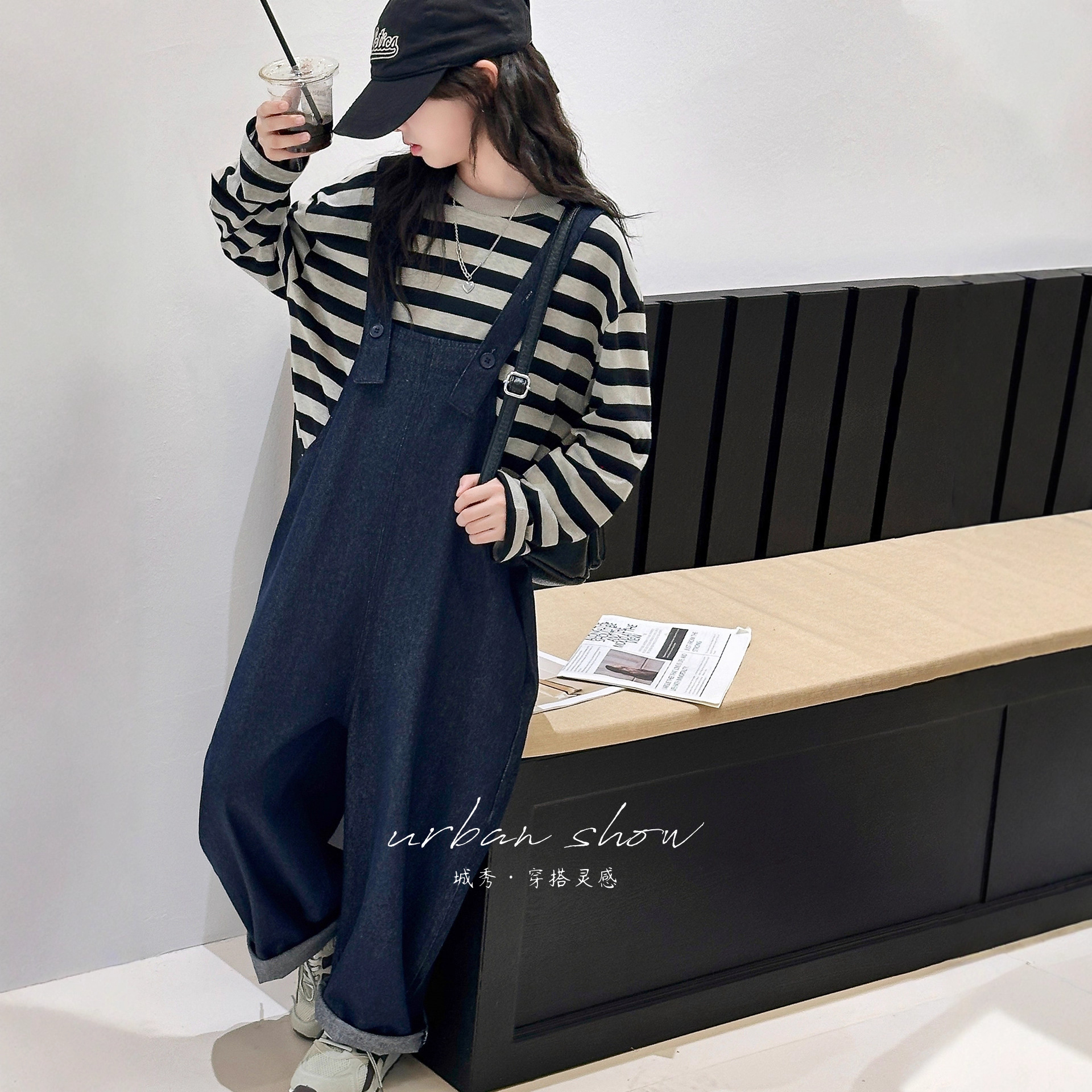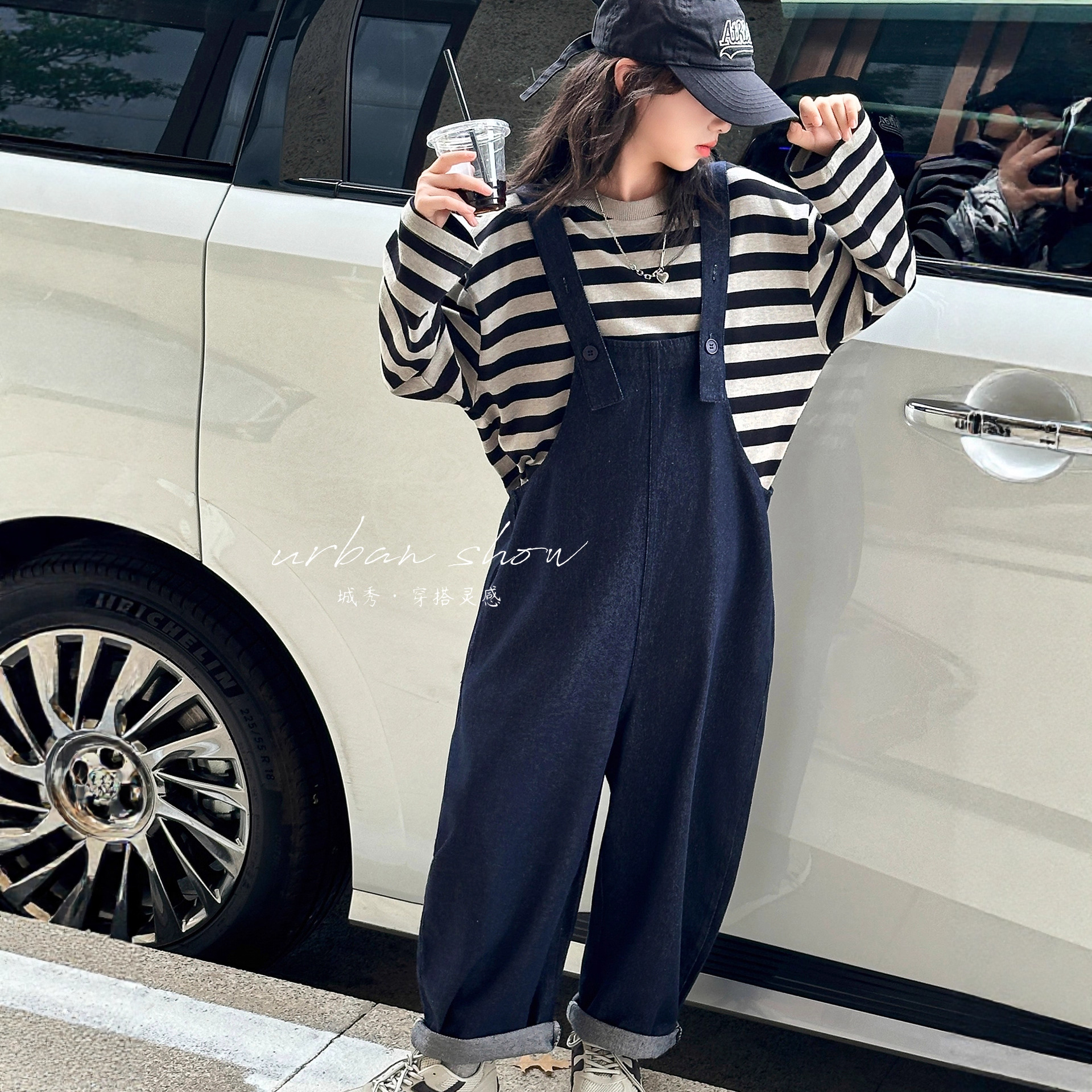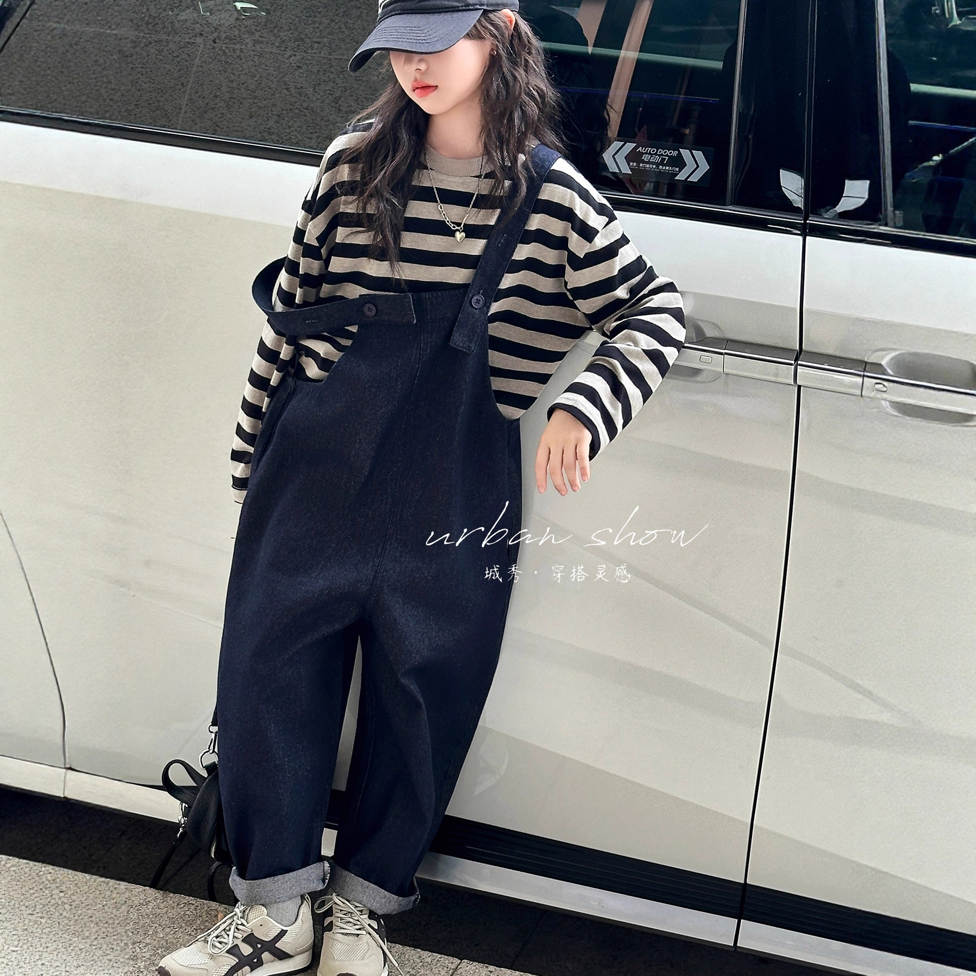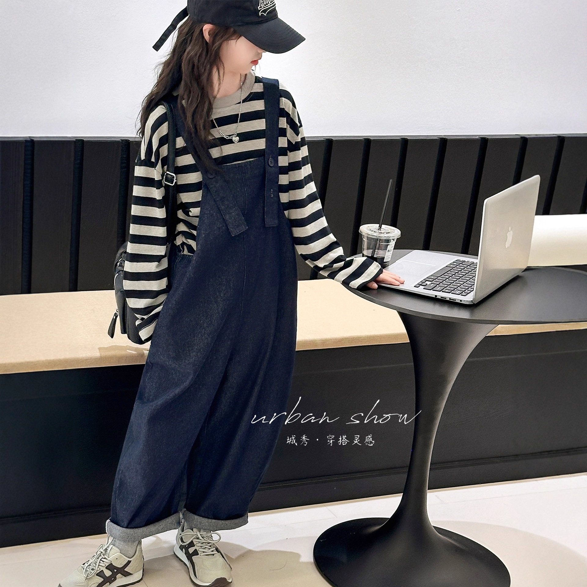 女童秋装套装2025新款儿童时髦洋气大童长袖T恤牛仔背带裤两件套