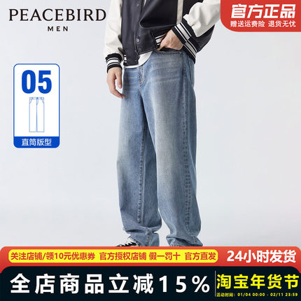 太平鸟男装 阔腿牛仔裤男新款美式复古水洗蓝色裤子宽松休闲裤潮