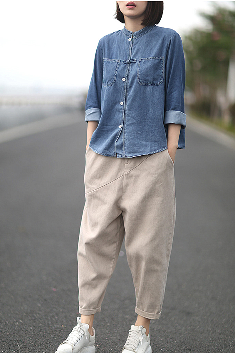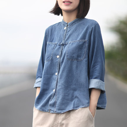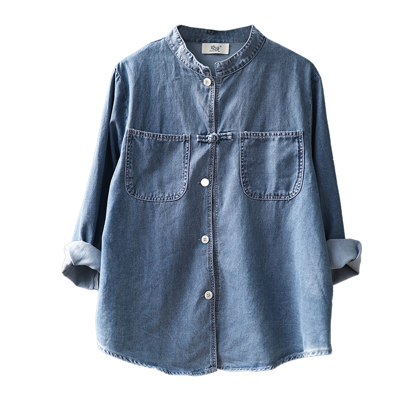 蓝色100%全棉牛仔文艺复古百搭立领盘扣衬衫女长袖宽松显瘦上衣