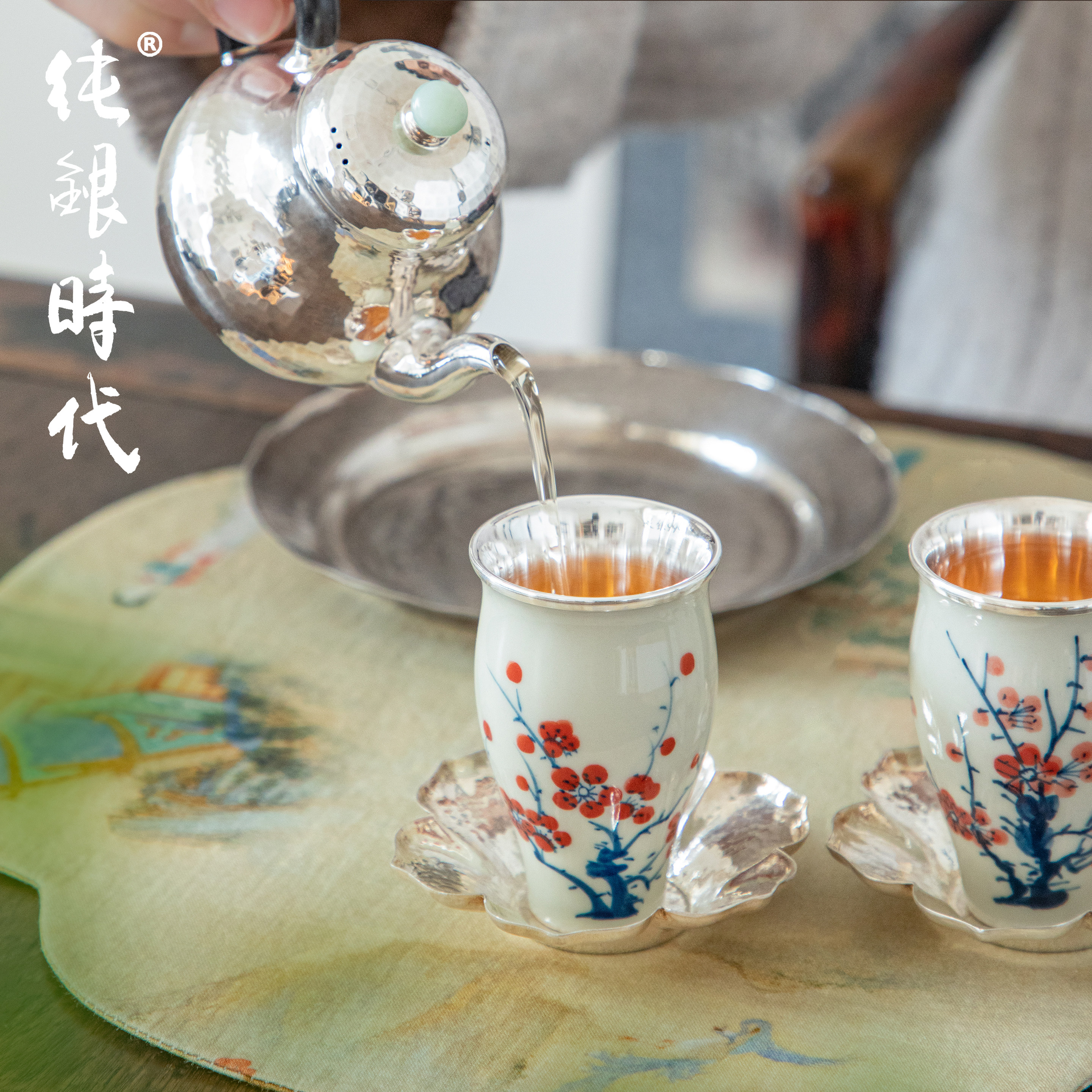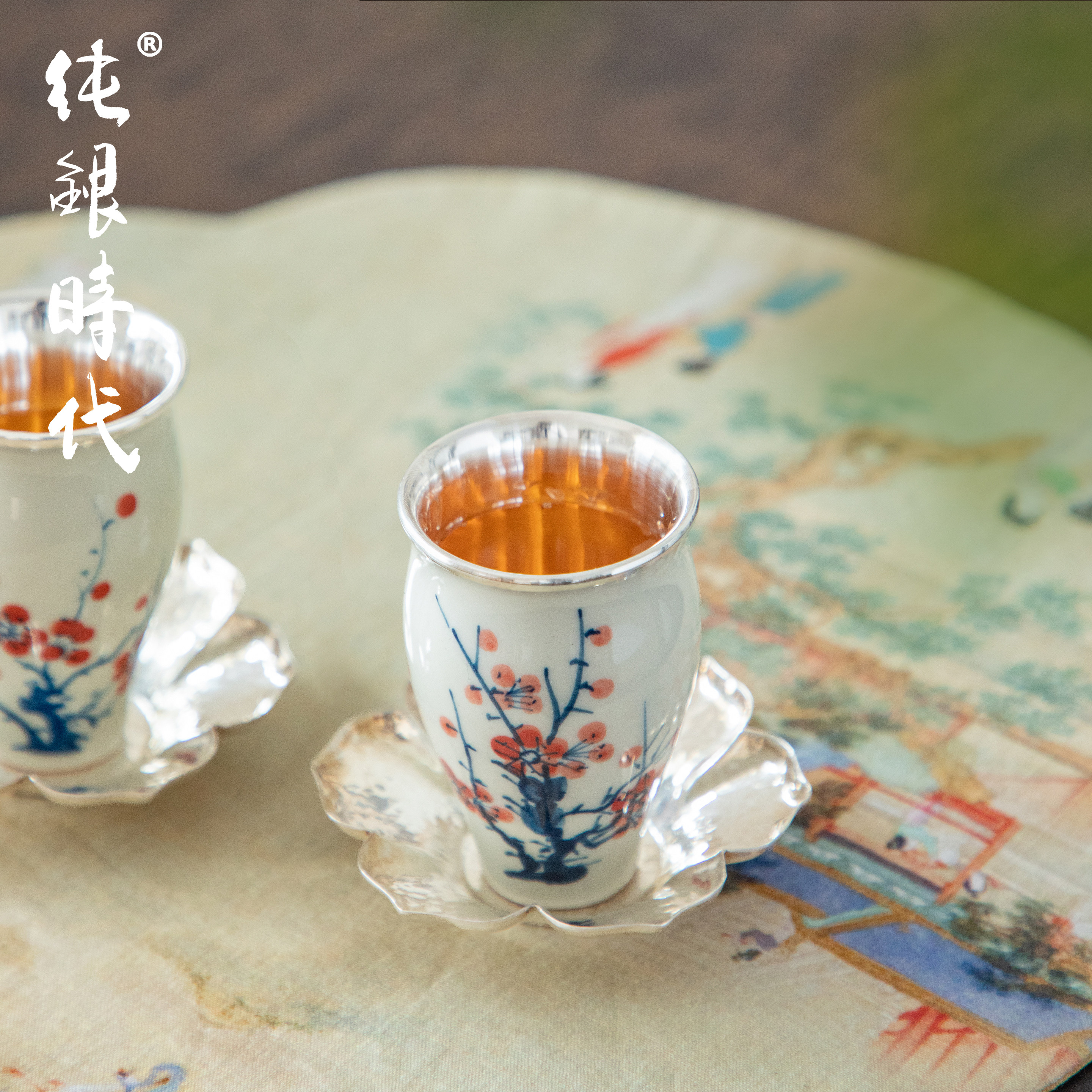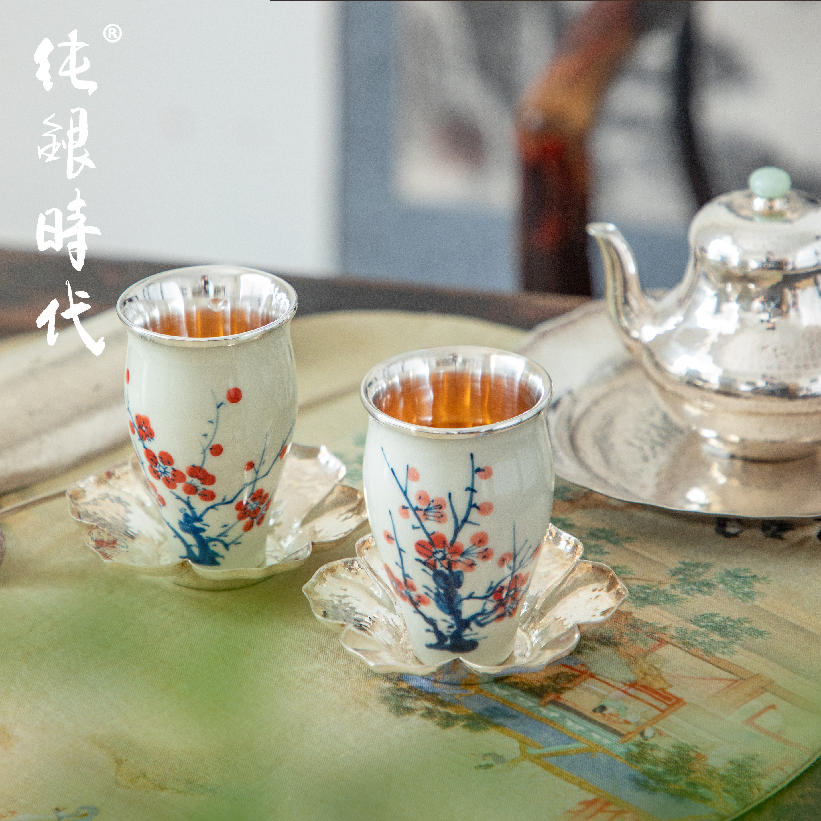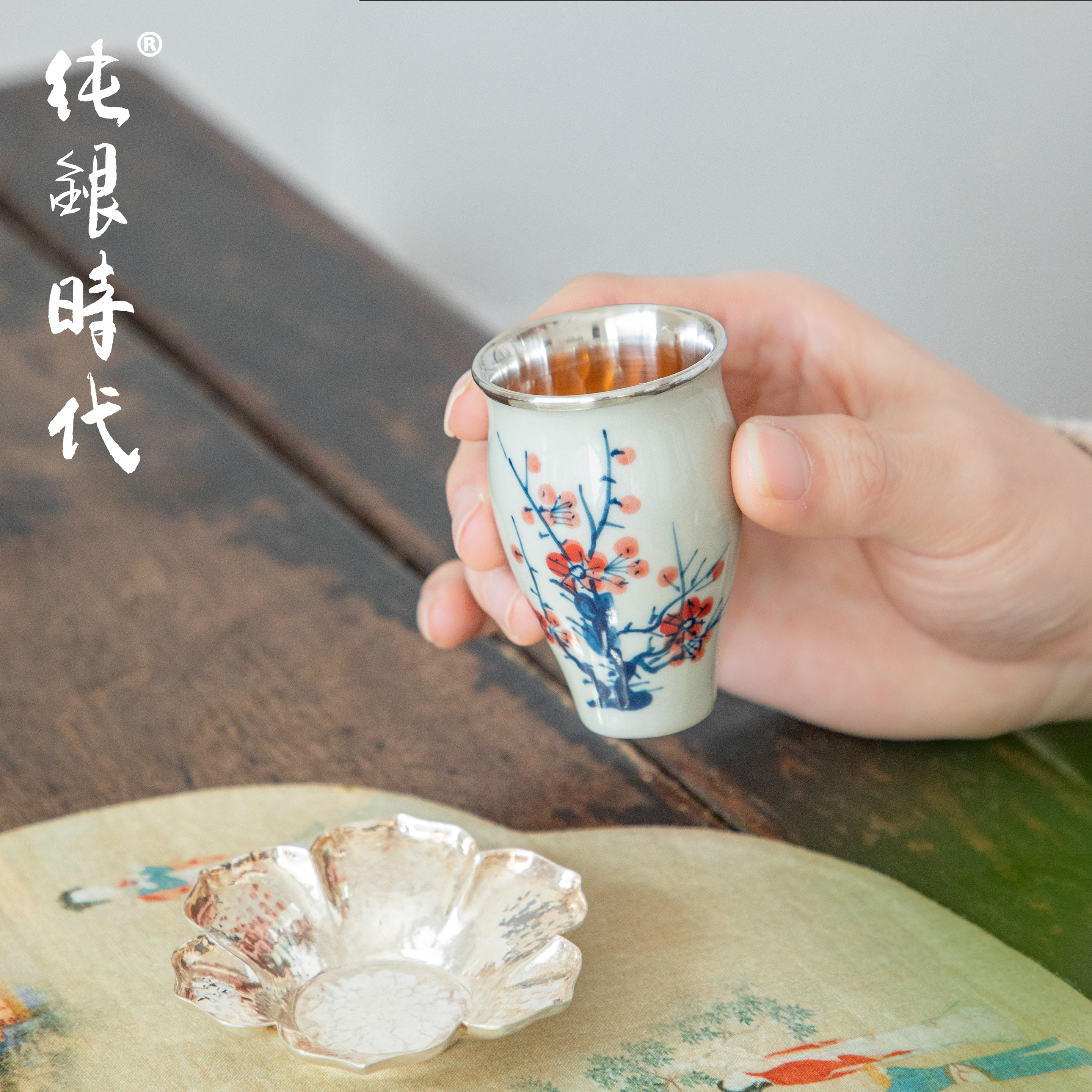 纯银时代 寒梅美人瓷包银杯纯银999中式手绘茶杯精美女士主人杯