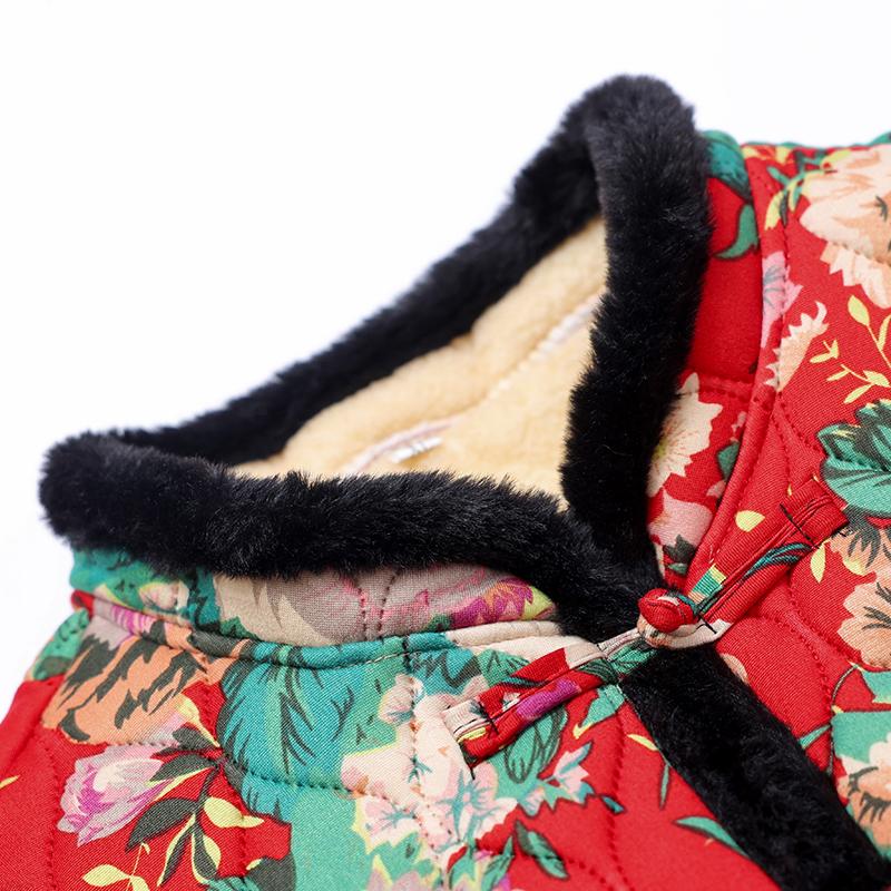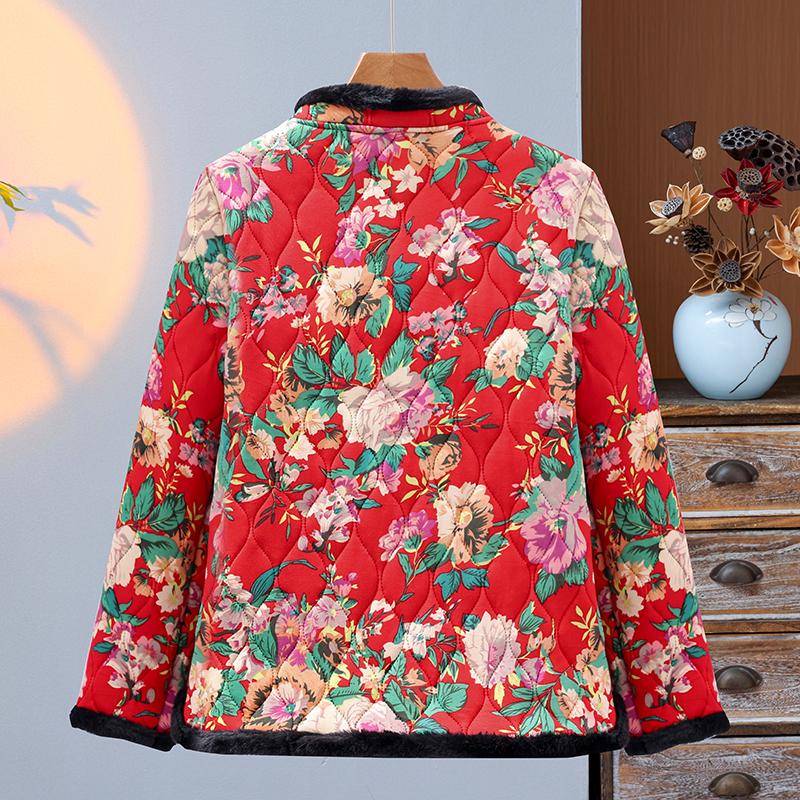 冬季妈妈装唐装加绒加厚外套中老年人女装保暖东北大花民族风棉衣