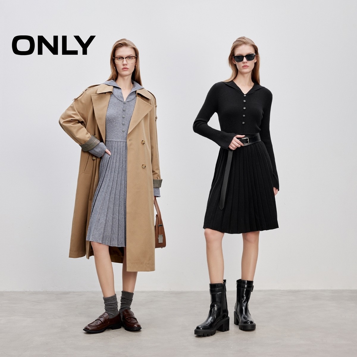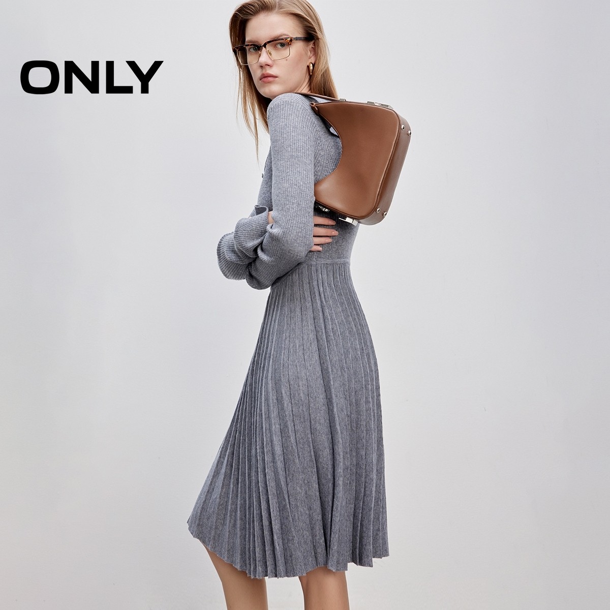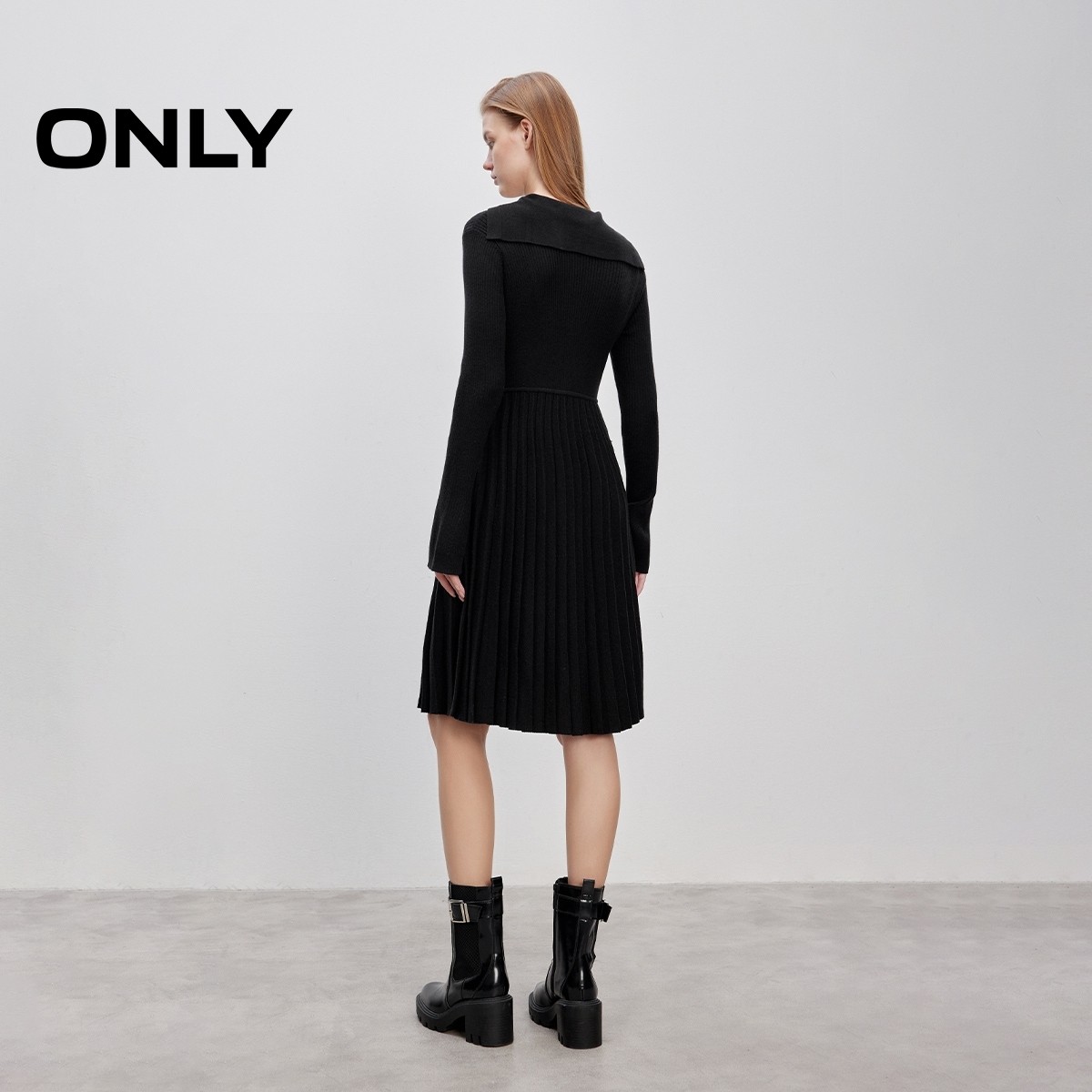 ONLY2025秋季新款通勤约会气质纯色长袖针织百褶裙中长裙连衣裙女