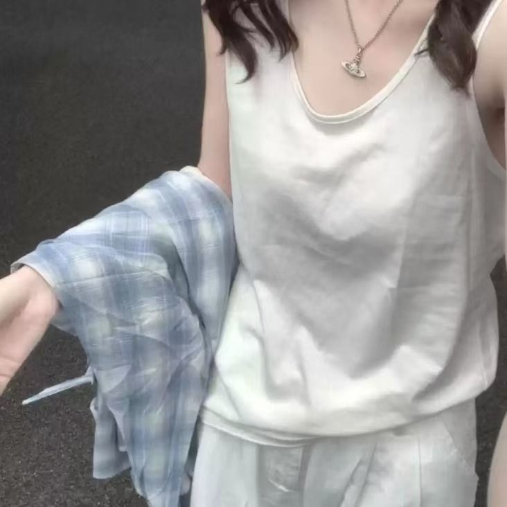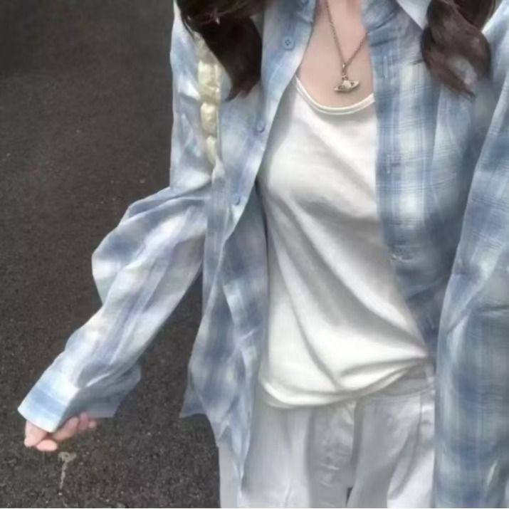 韩系慵懒蓝色格子衬衫女春夏宽松衬衣外套休闲长袖外搭防晒上衣