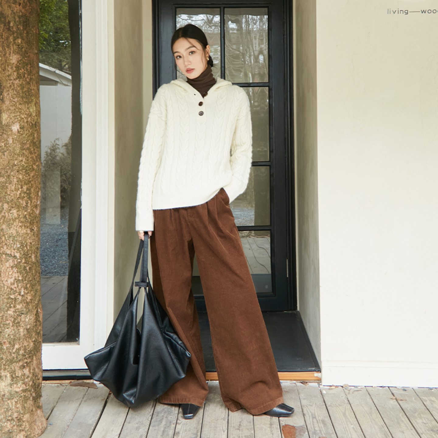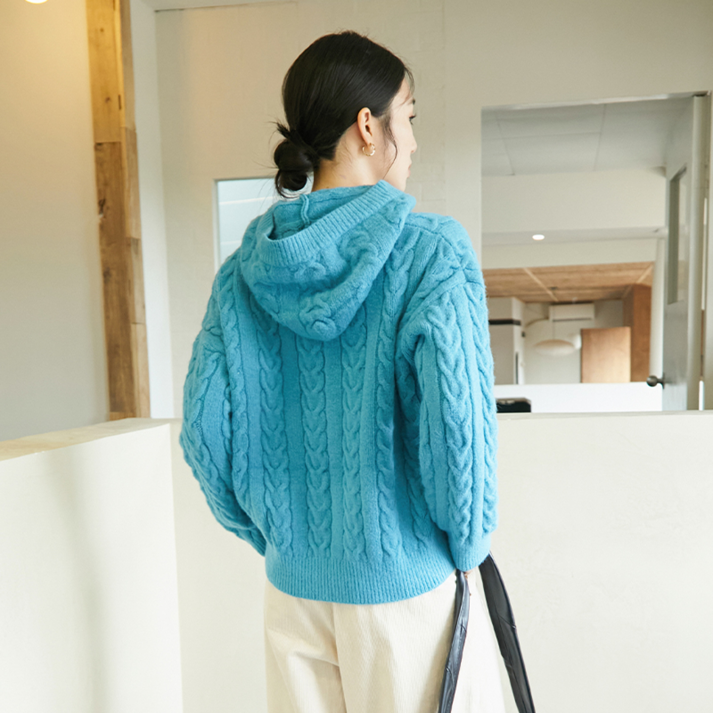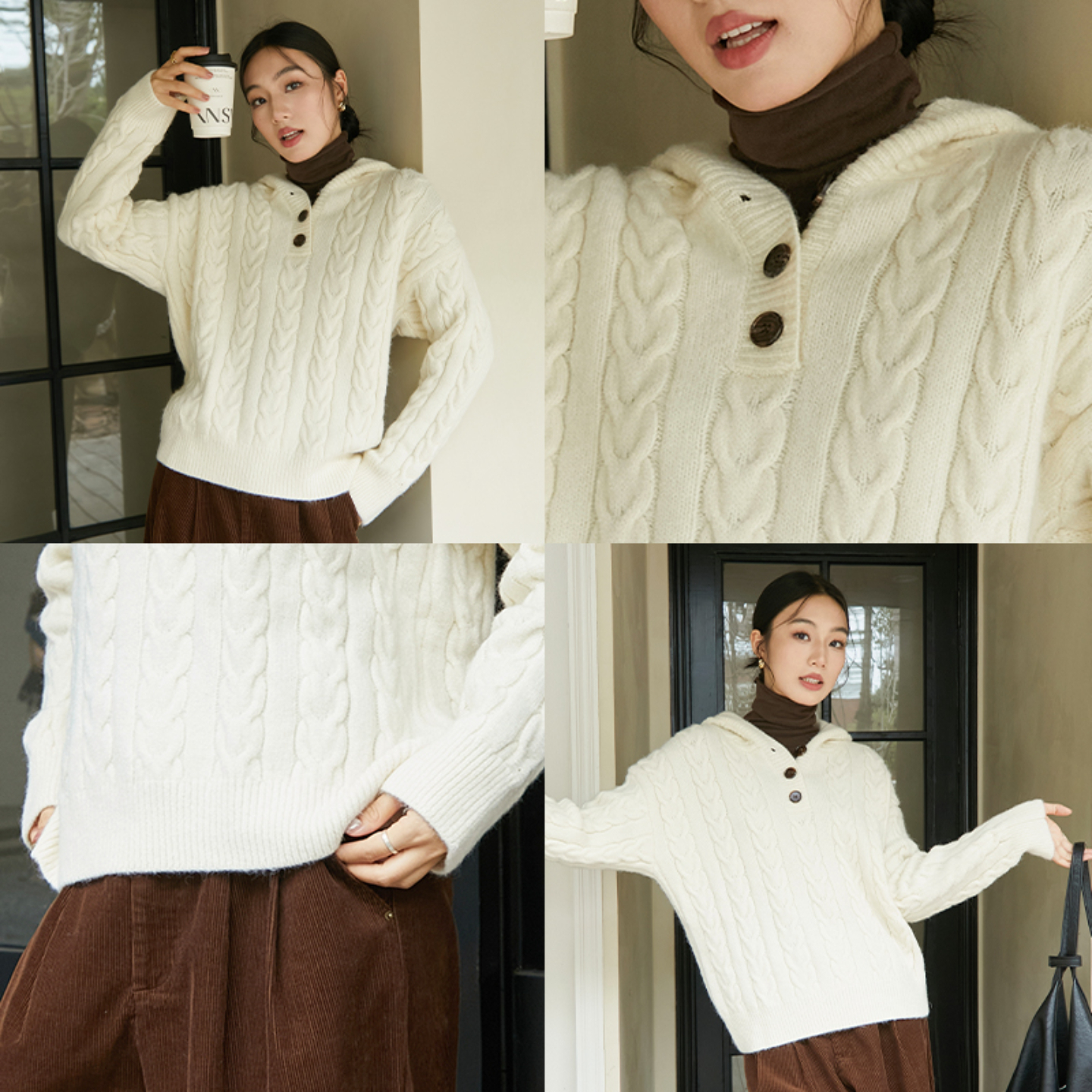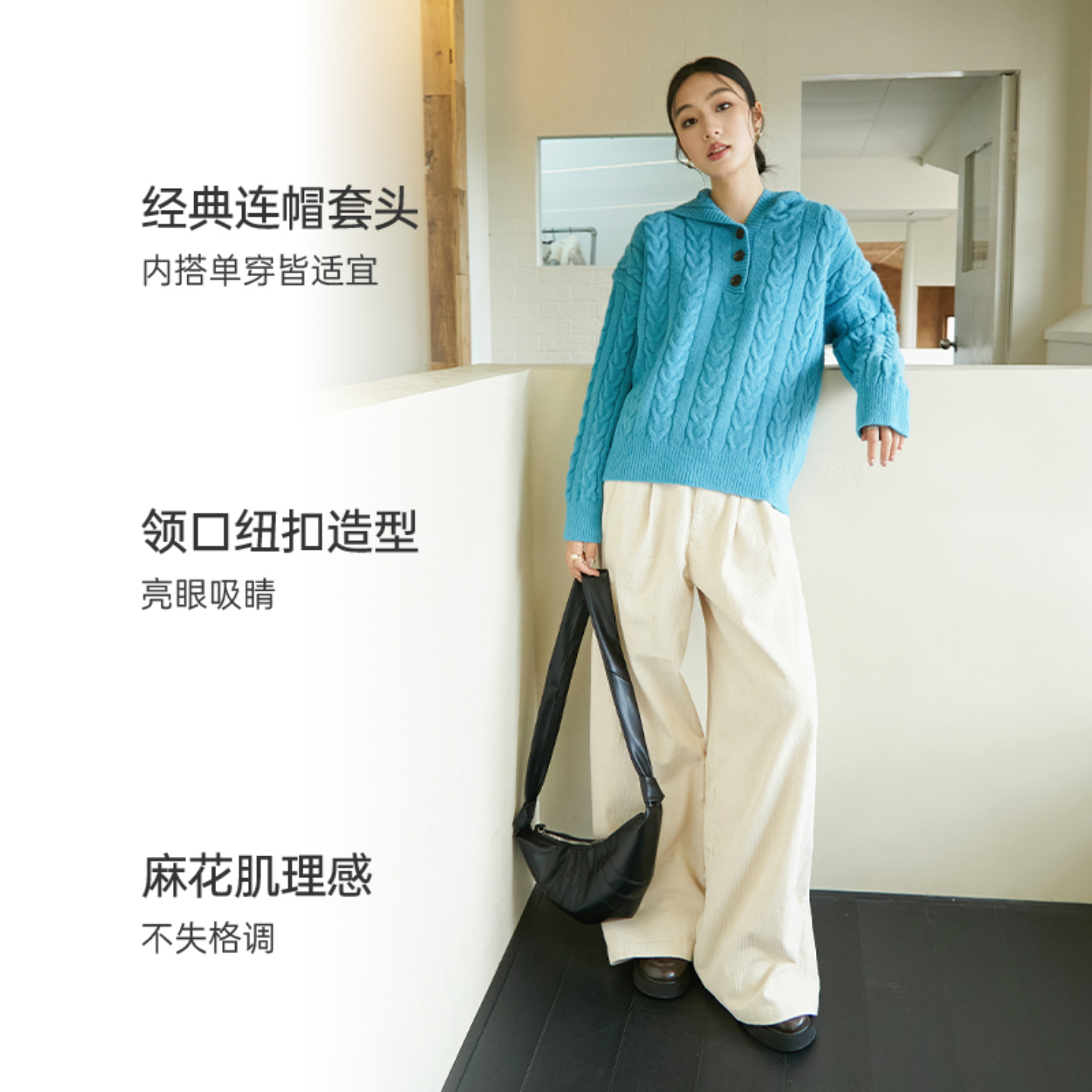 北欧时刻慵懒风麻花连帽厚毛衣女春季新款外套杏色套头针织衫上衣