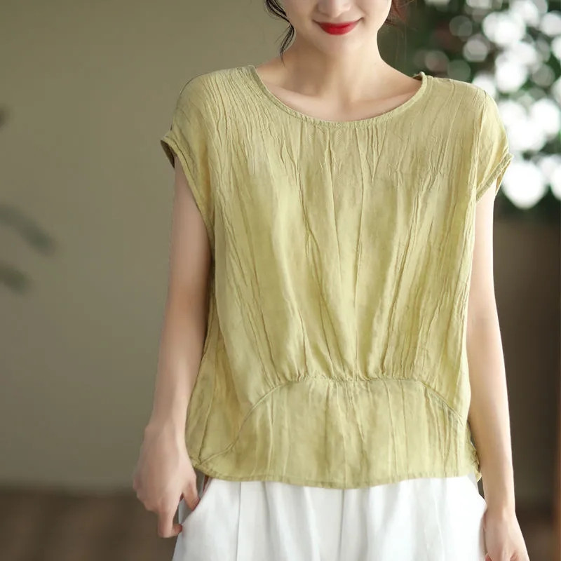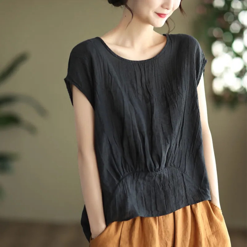 2024夏新款复古褶皱摆棉麻苎麻上衣女气质短袖T恤文艺宽松套头衫