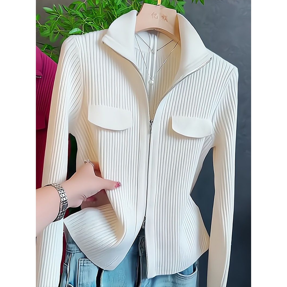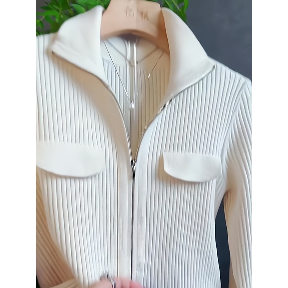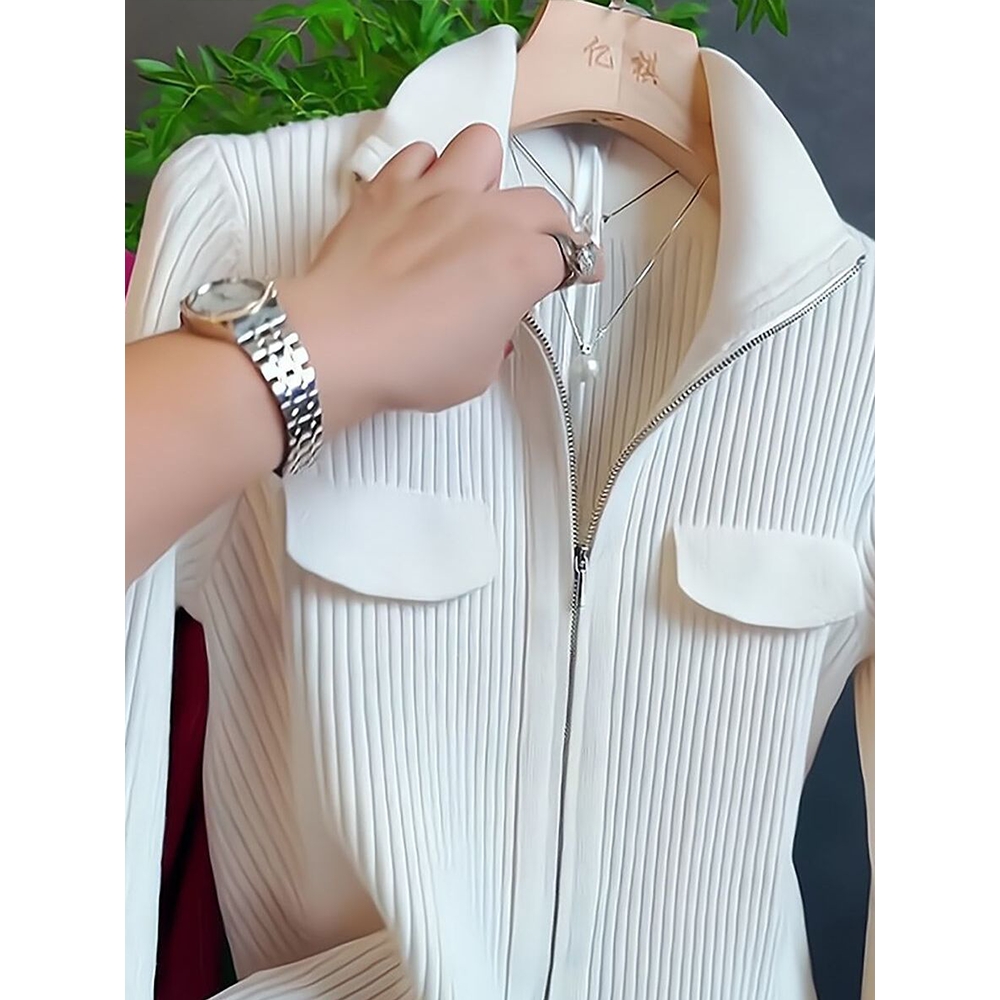 欧洲站高级感双拉链翻领针织开衫外套女春秋冬大码显瘦白色毛衣欧