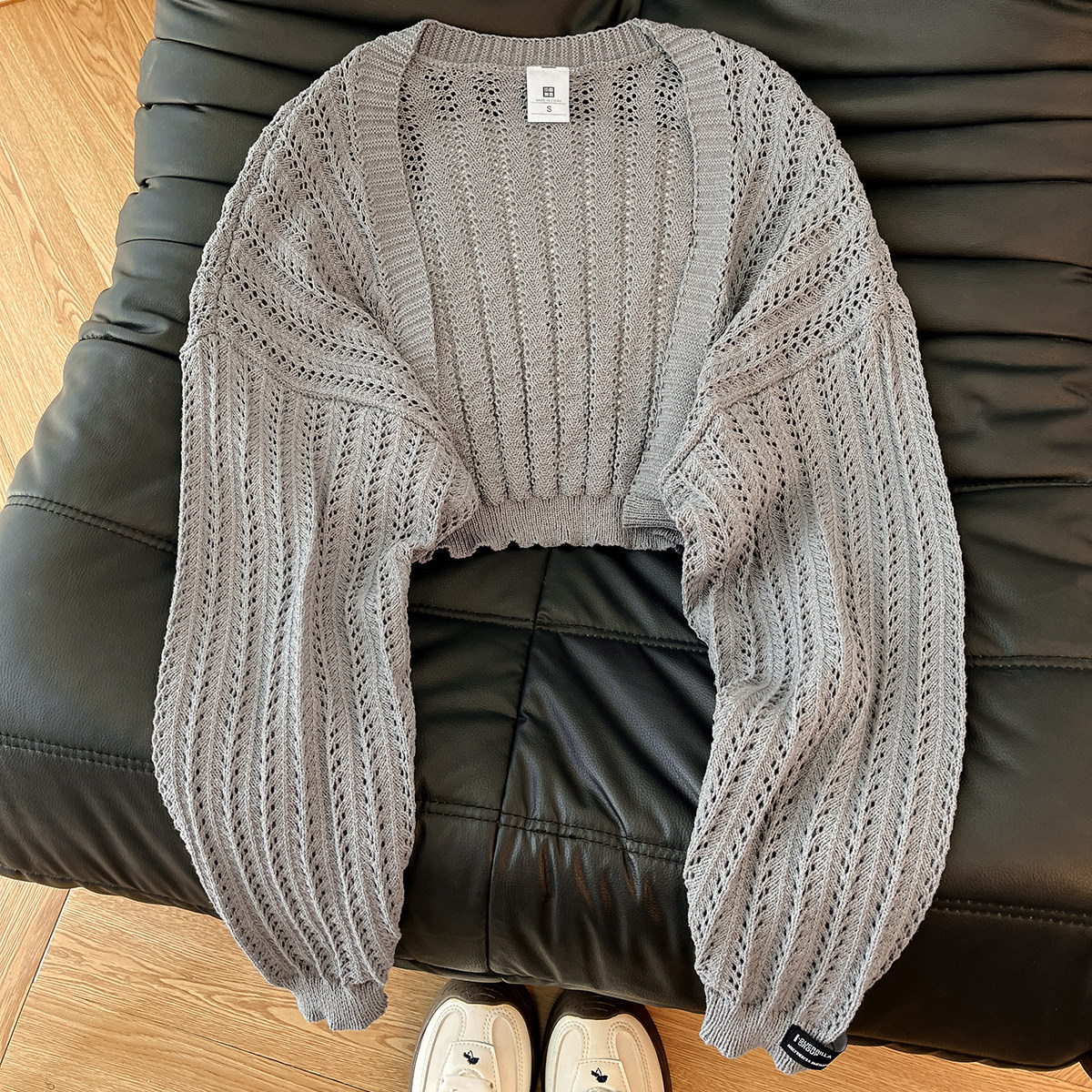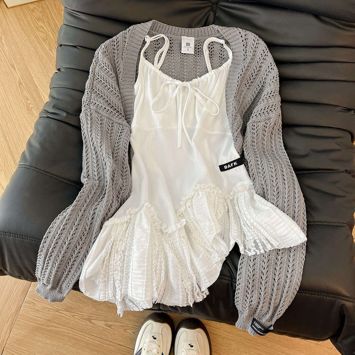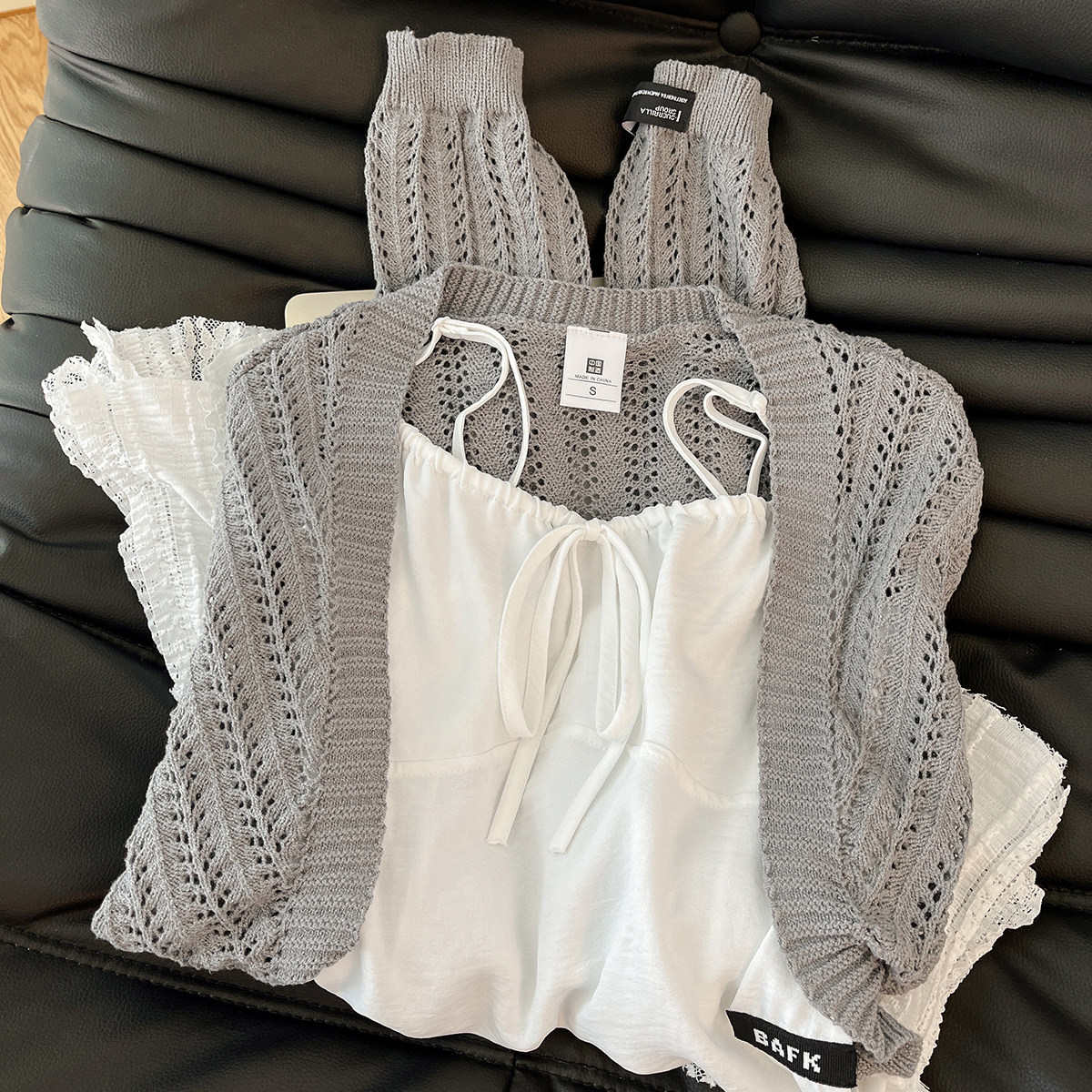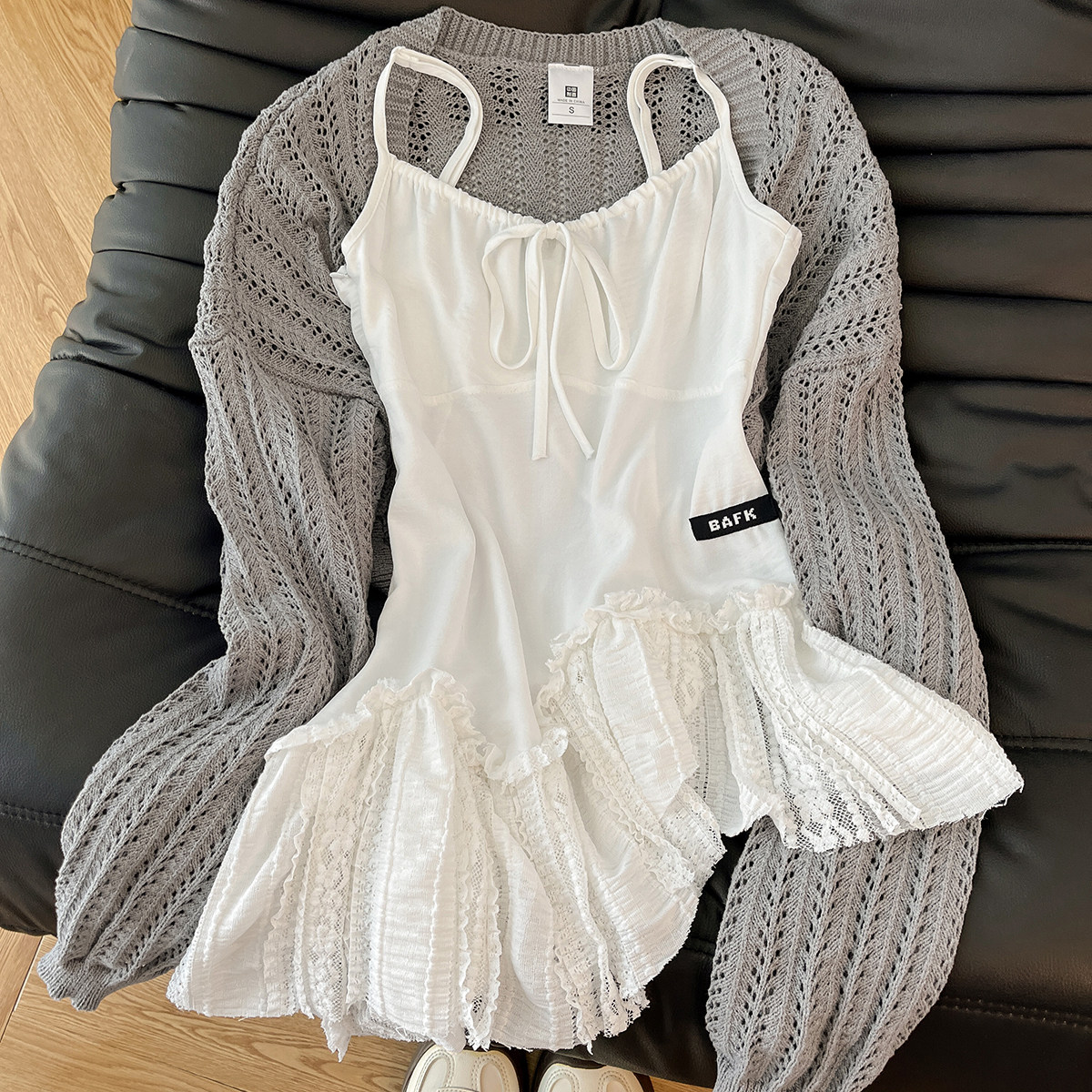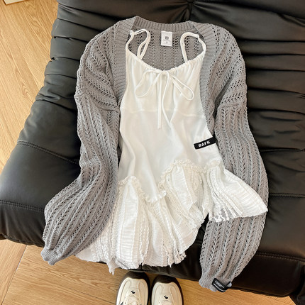 奶欲小芭蕾!韩风chic一整套蕾丝拼接吊带背心女灰色针织开衫套装