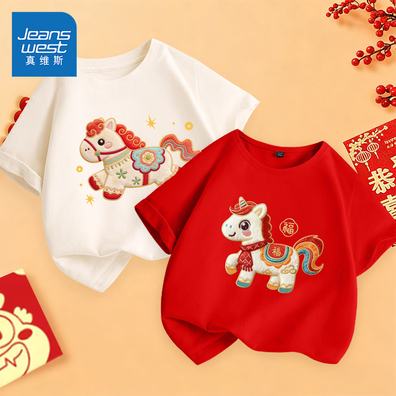 真维斯童装男童新年款短袖2026冬季新款儿童红色内搭大童亲肤T恤