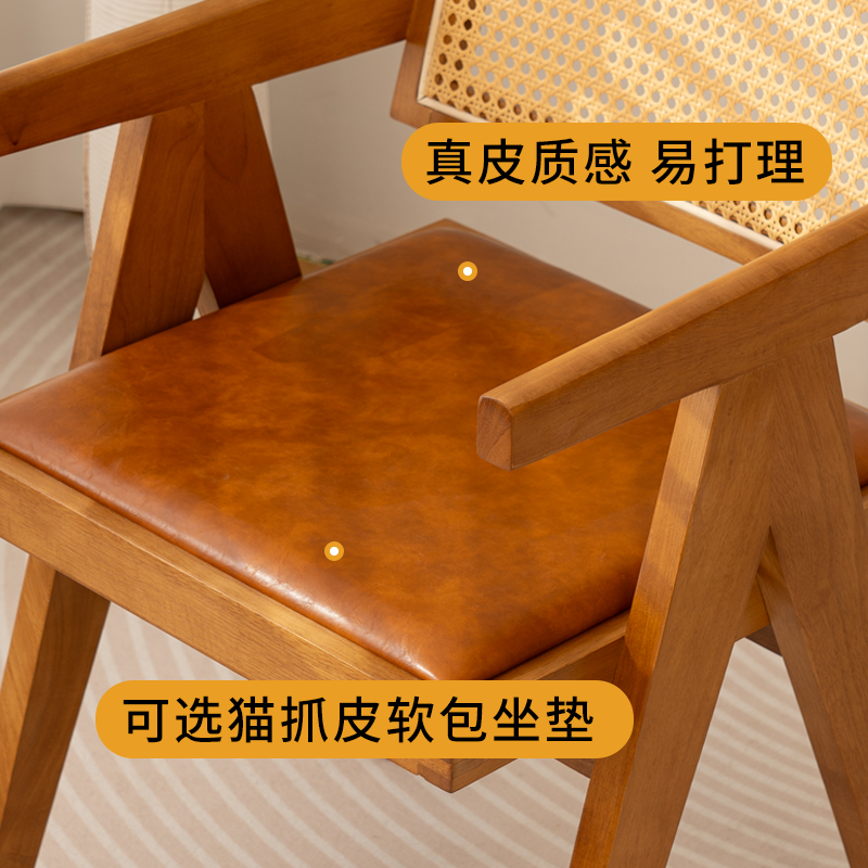藤编实木餐椅家用靠背椅子靠背扶手侘寂风民宿椅子昌迪加尔椅
