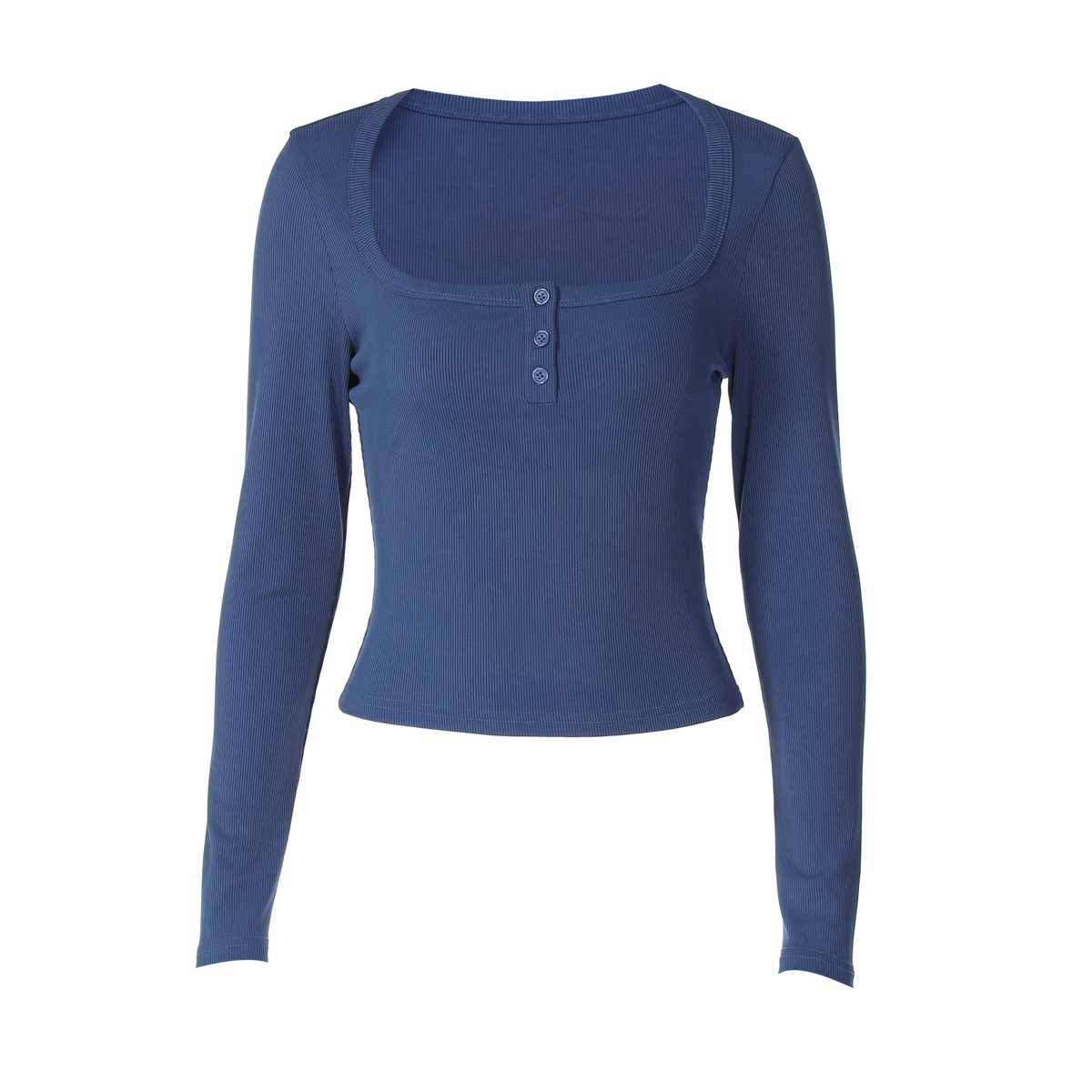 shemoda日常纽扣半开方领长袖T恤女秋季百搭高腰修身显瘦辣妹上衣