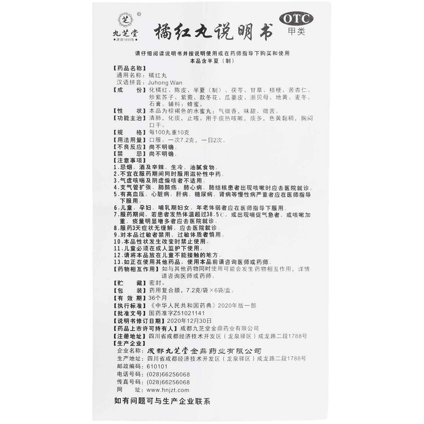 九芝堂橘红丸7.2g*6袋/盒 用于痰热咳嗽痰多色黄粘稠清肺化痰止咳