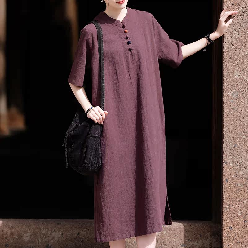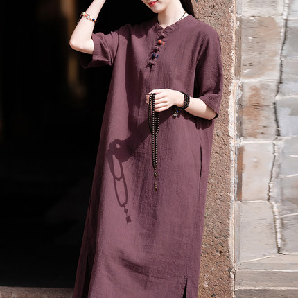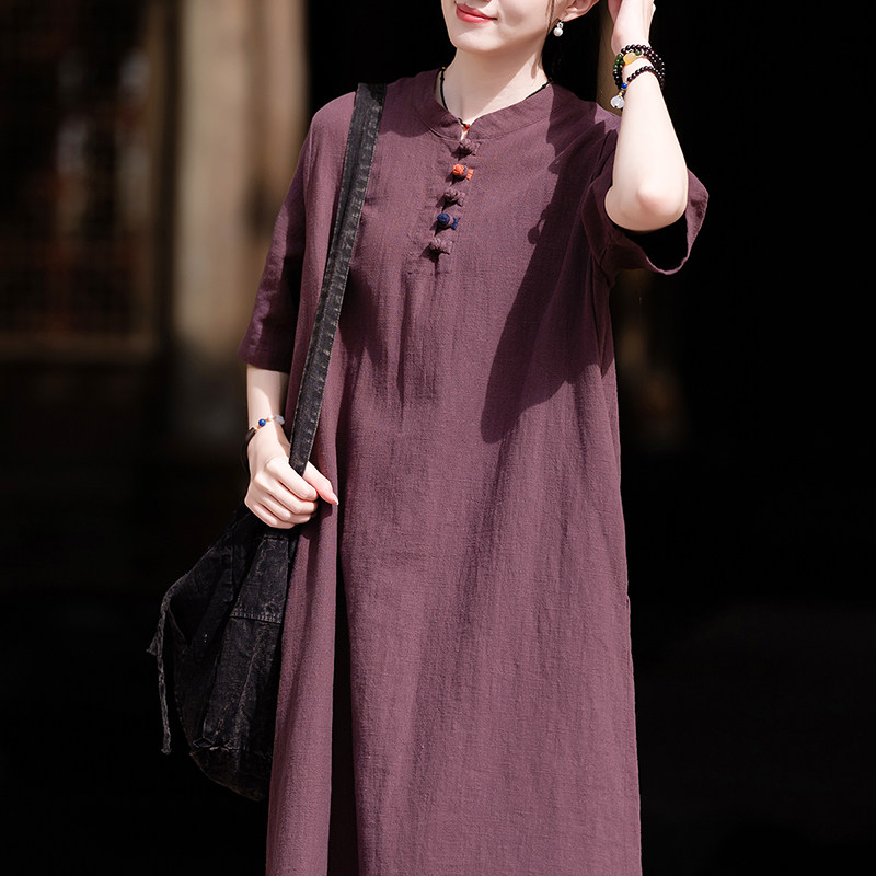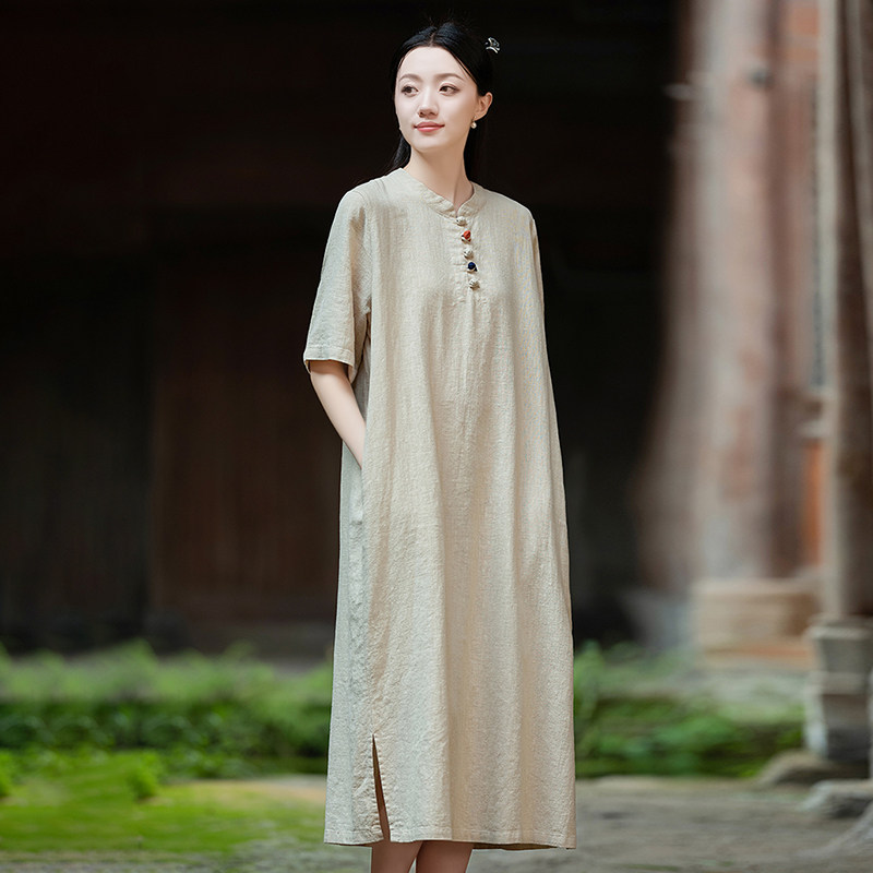 苎麻复古连衣裙女2025年春秋新款棉麻宽松百搭中长款禅意茶服袍子