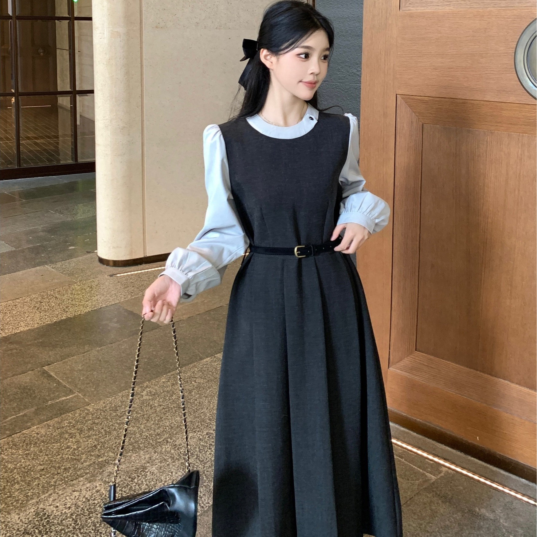 大码法式假两件长袖连衣裙女装秋季小个子胖MM收腰显瘦设计感裙子