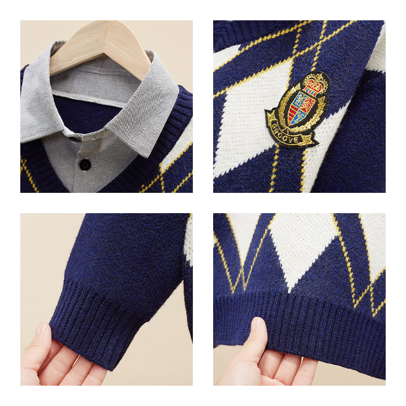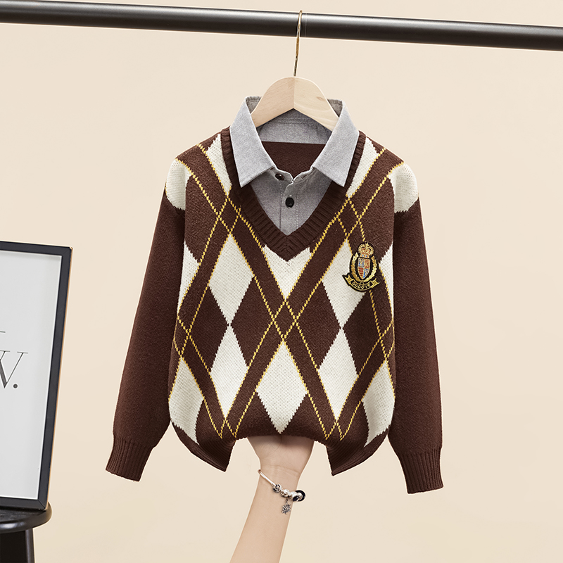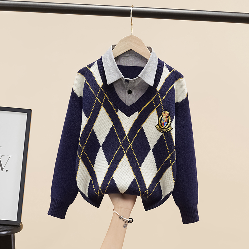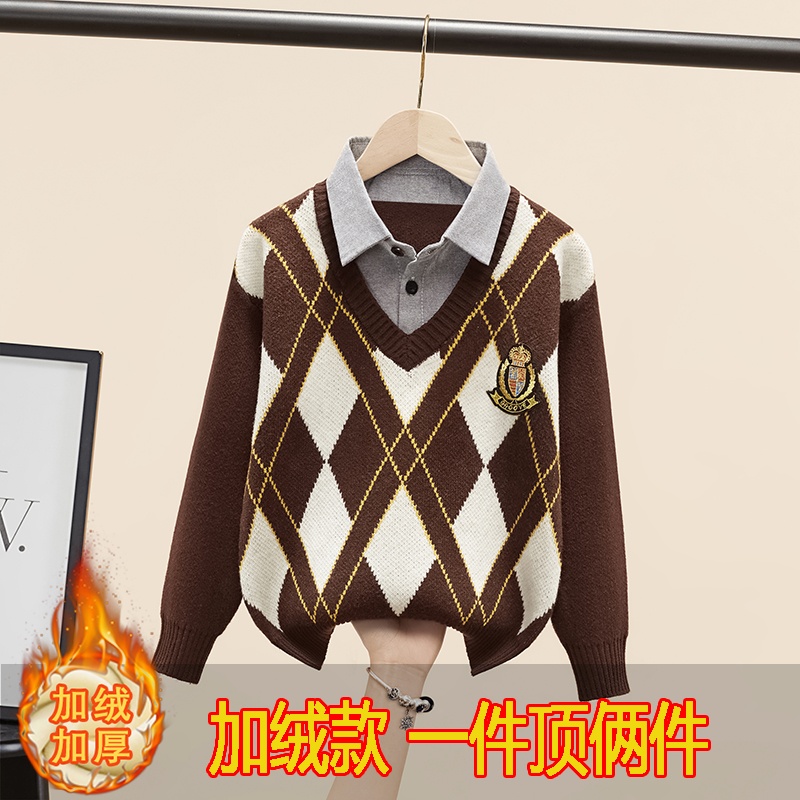 男童加厚款假两件毛衣3-15岁儿童秋冬装帅气菱形针织衫中大童男孩