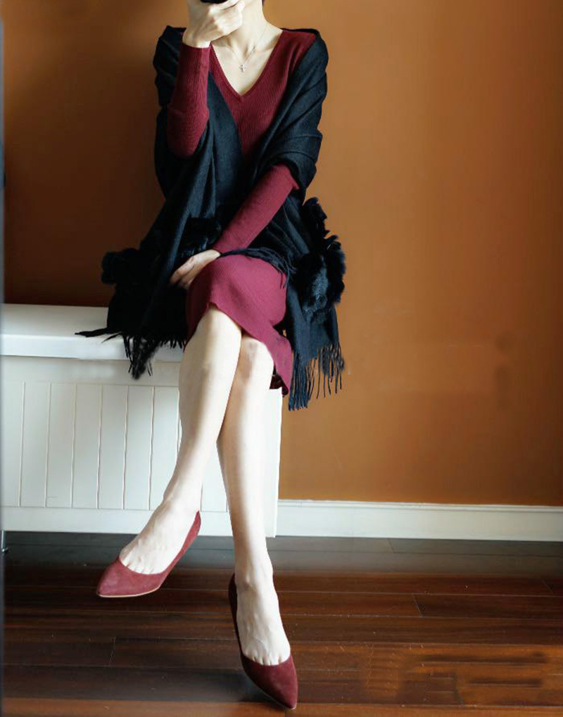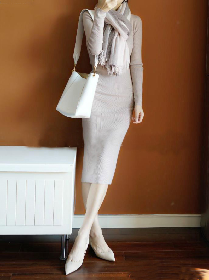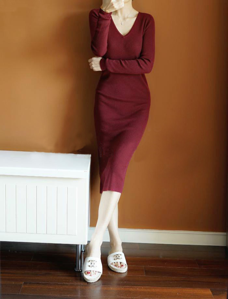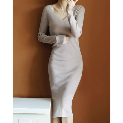 摇曳生姿!通勤好物~长款羊绒衫女V领中长款纯羊绒毛衣针织连衣裙