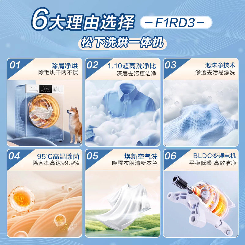 松下大白10KG超薄全自动家用洗烘一体滚筒洗衣机变频除菌F1RD3