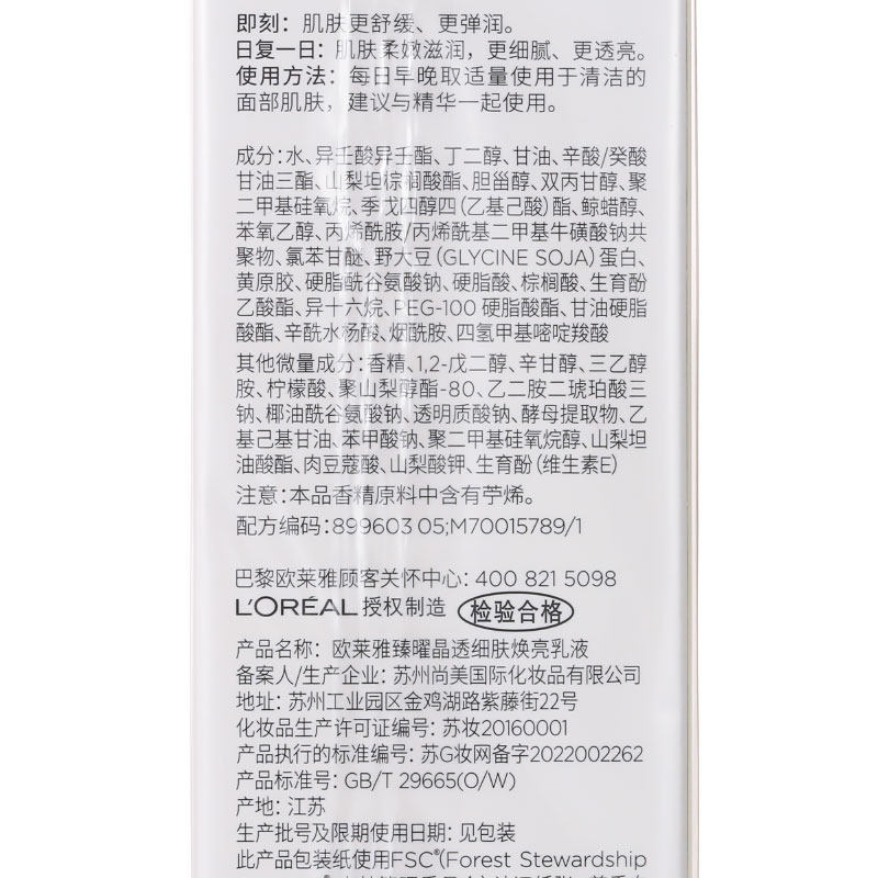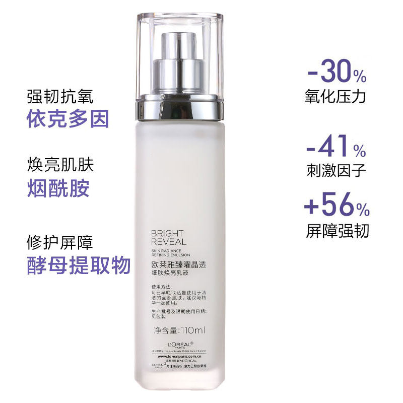 欧莱雅臻曜晶透细肤焕亮乳液110m女清爽补水保湿去黄改善暗沉