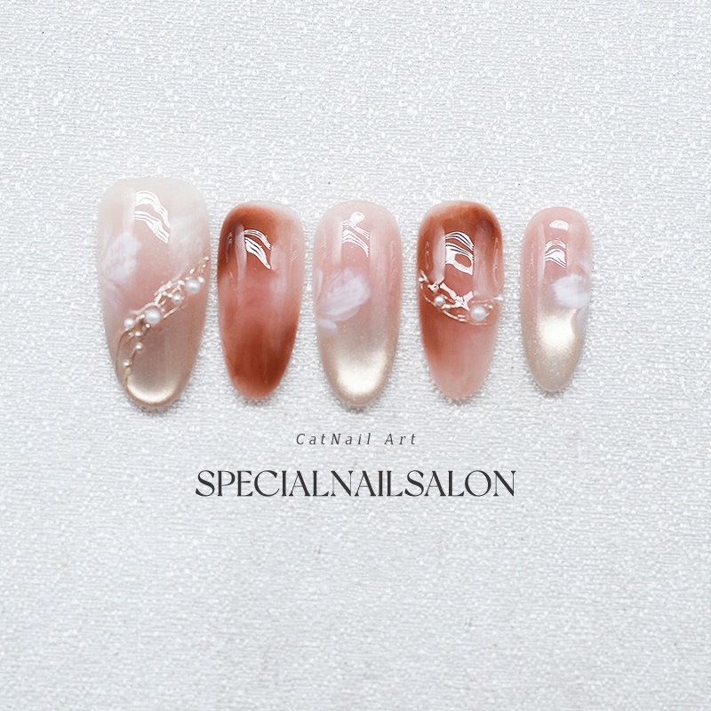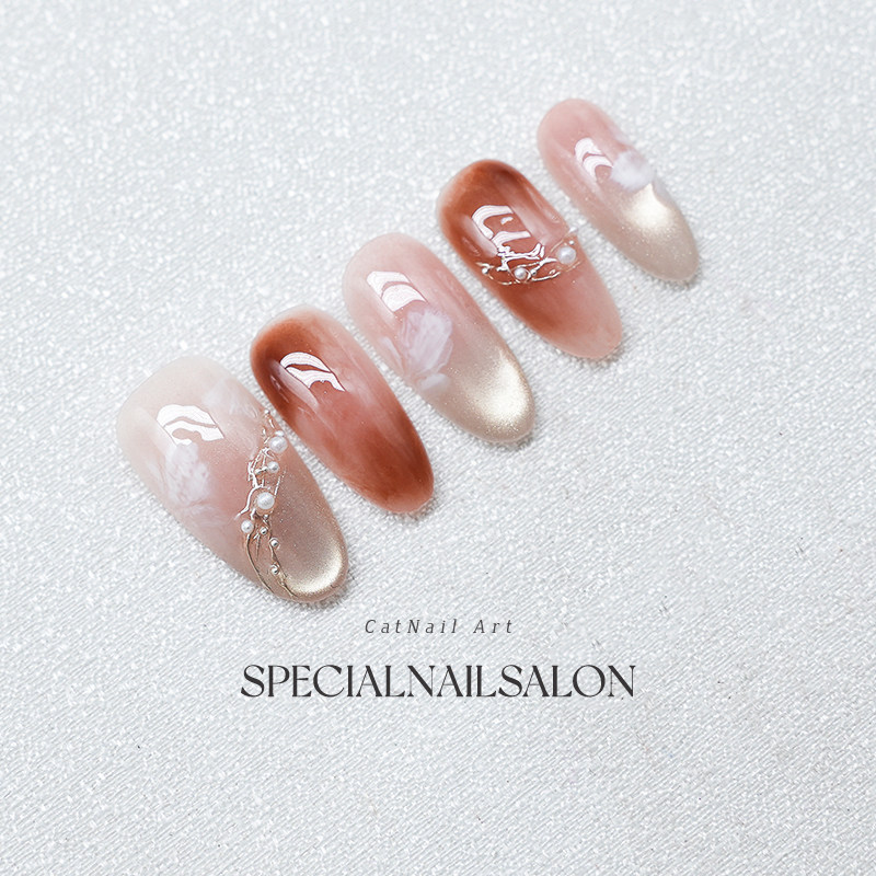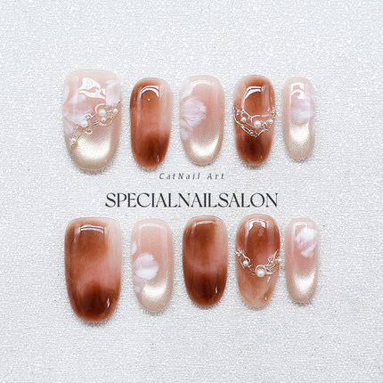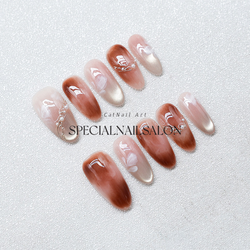 【雾羽花漾】纯手工穿戴式美甲焦糖色晕染甜美花卉高级感指甲贴片