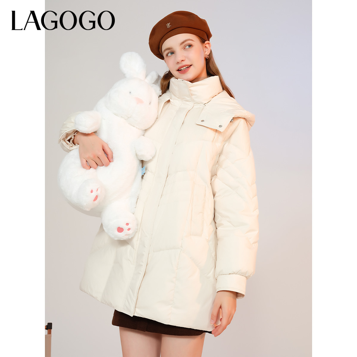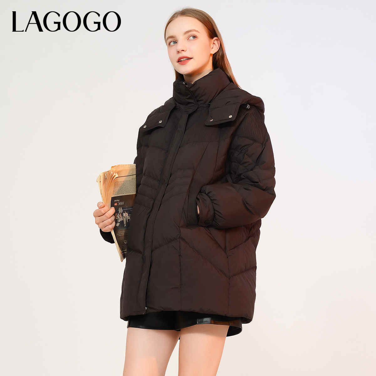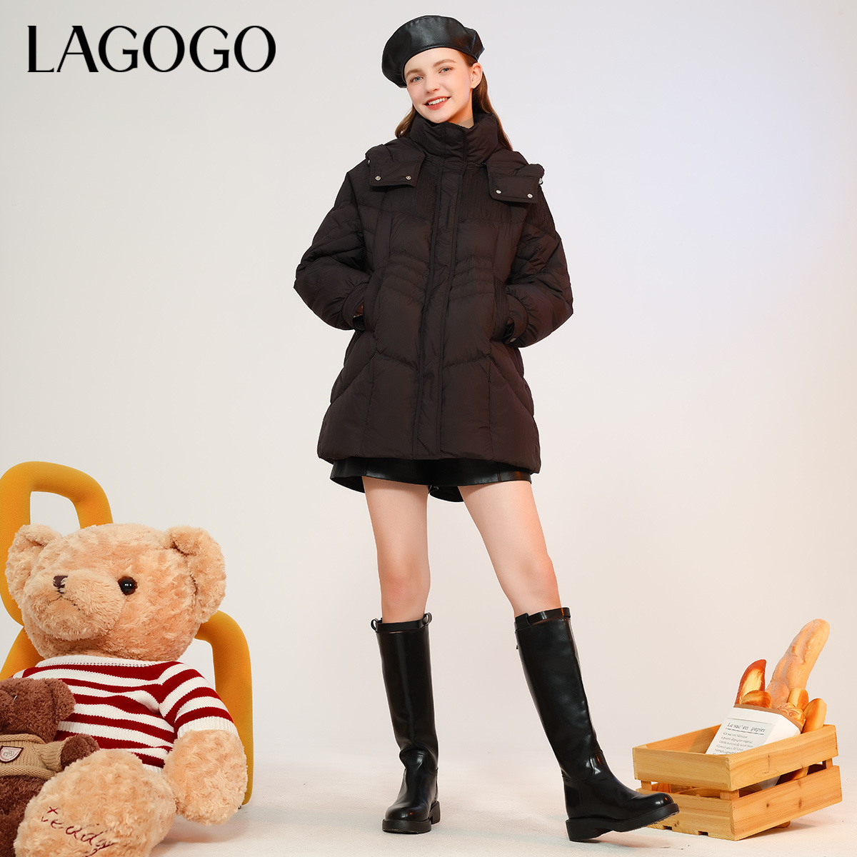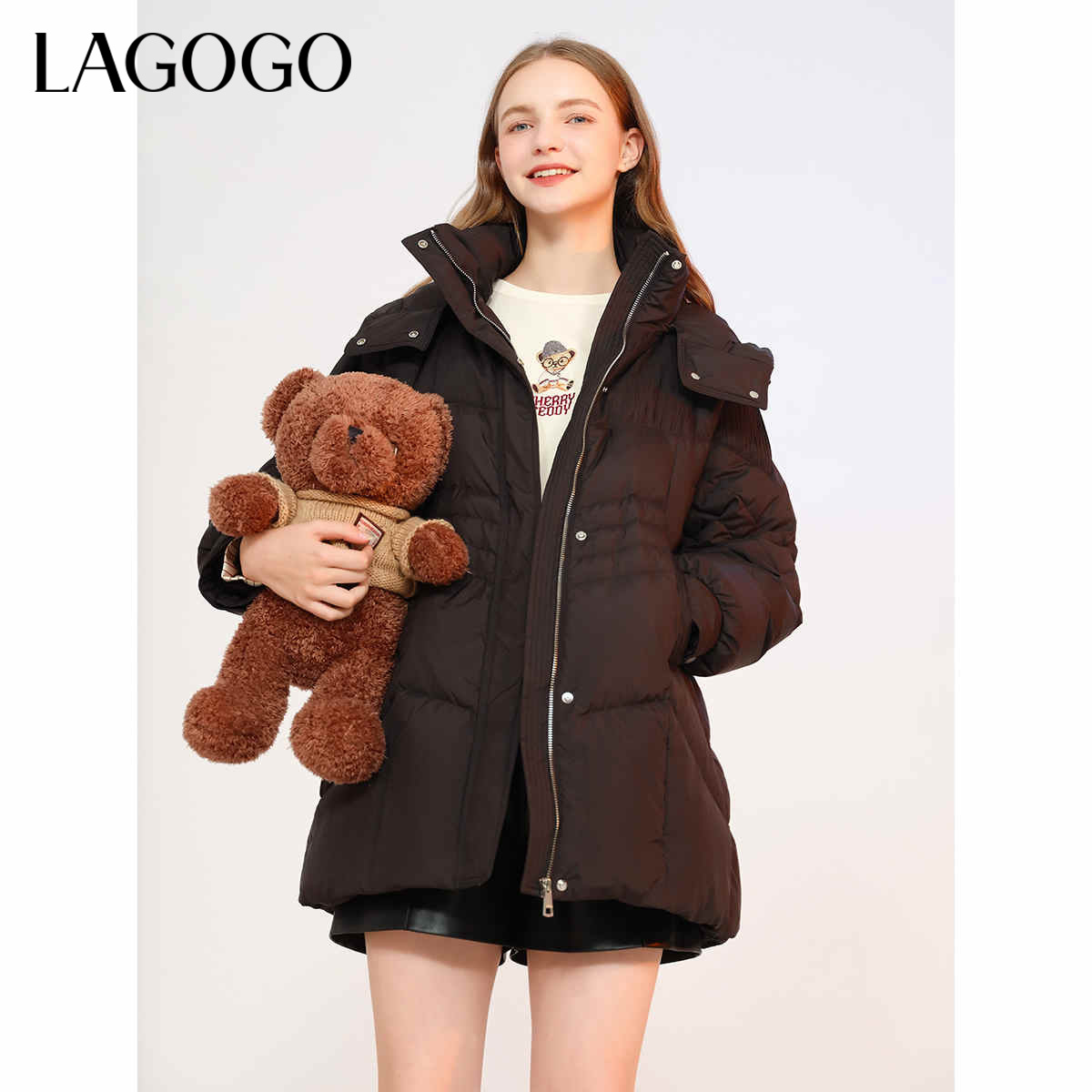LAGOGO时尚黑色连帽羽绒服女拉谷谷冬季新款加厚高品质中长款外套