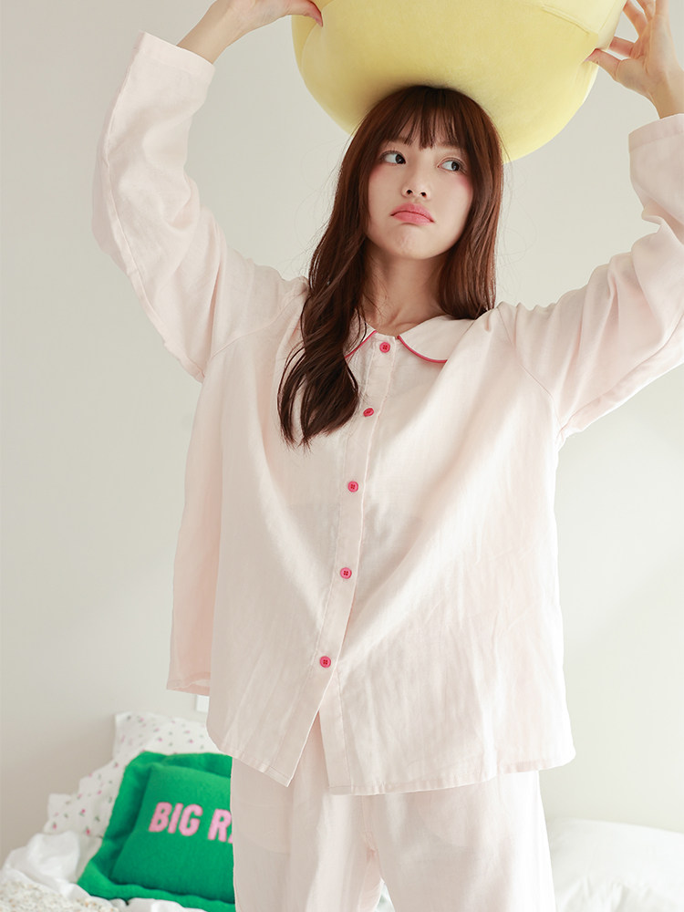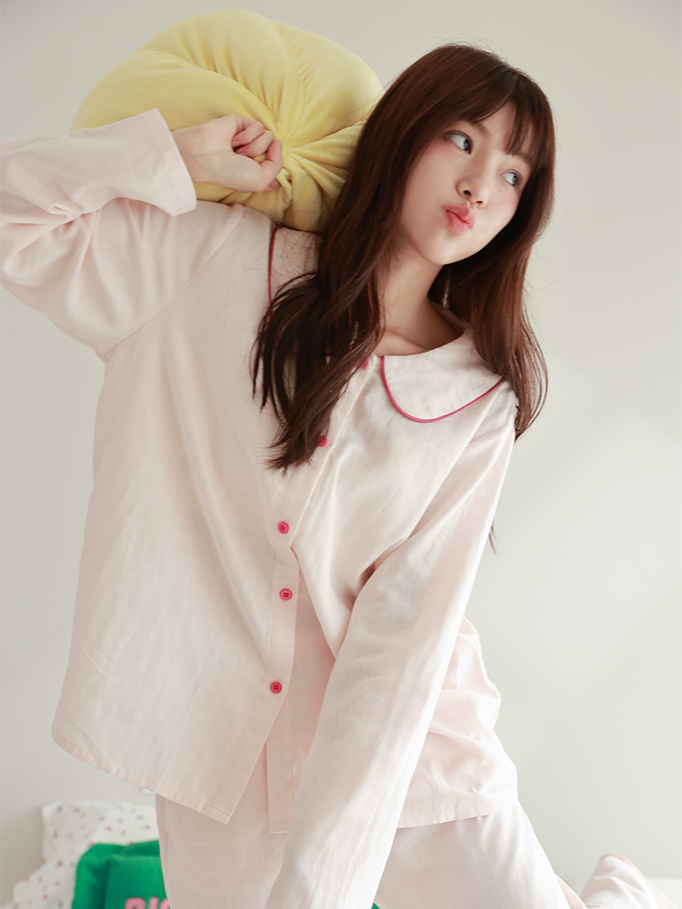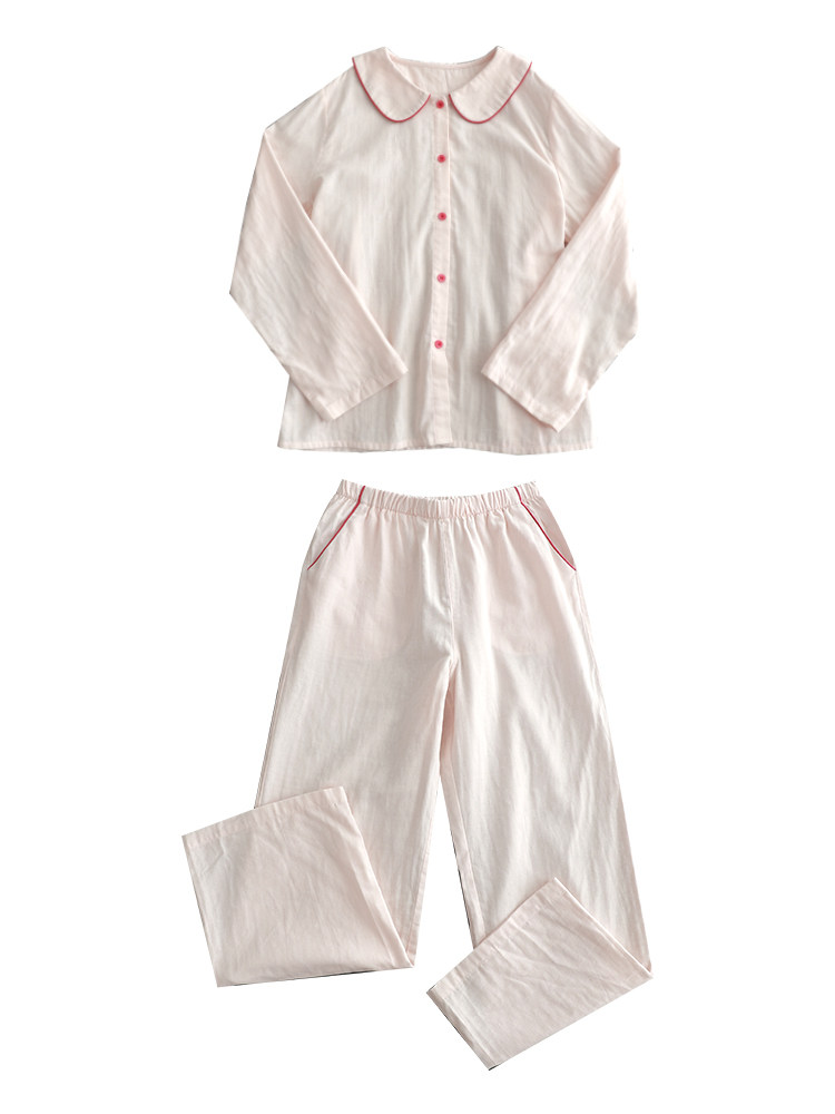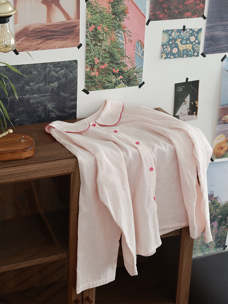 甜桃汽水@馍馍自制纯棉纱布治愈粉色少女温柔睡衣长袖家居服套装