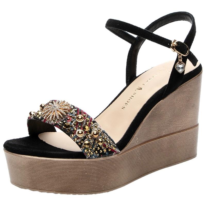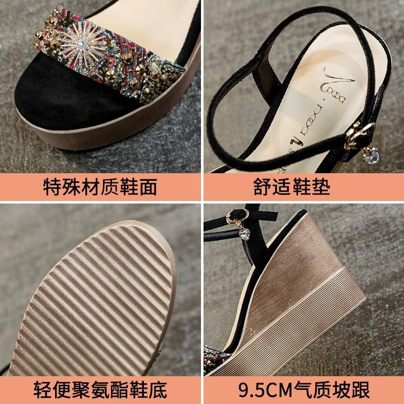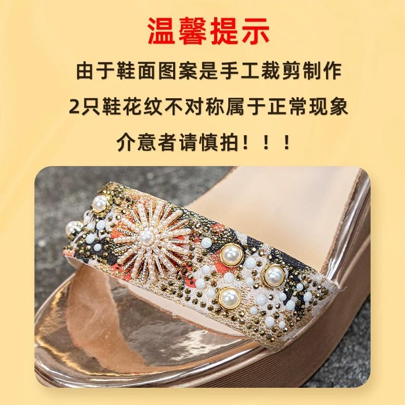 金色一字带坡跟凉鞋女2025新款夏季水钻增高厚底防水台鱼嘴高跟鞋