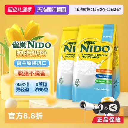 【自营】雀巢NIDO荷兰进口高钙高蛋白脱脂成人奶粉低糖400g*2袋