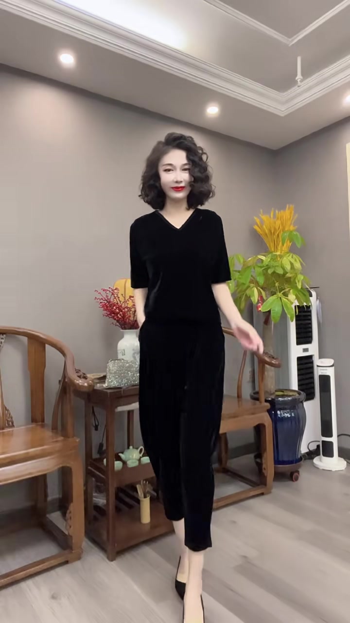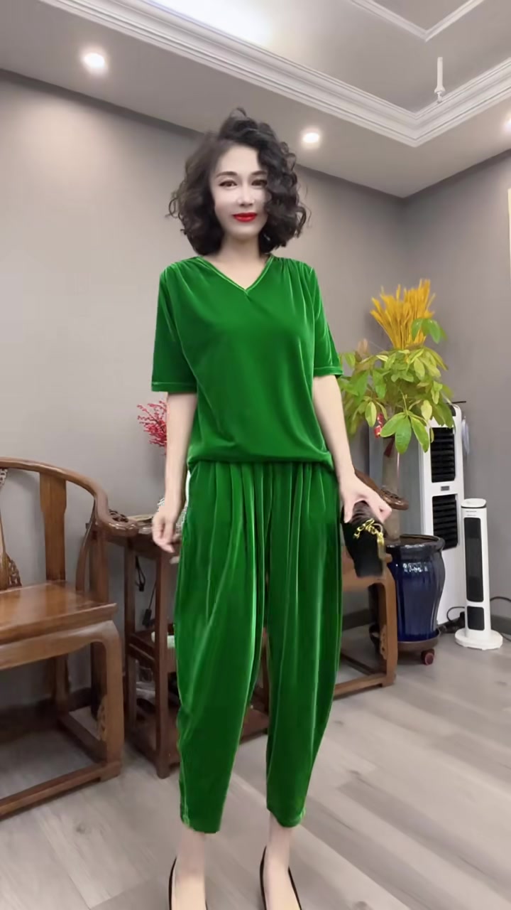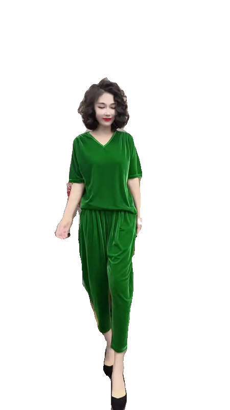 夏季新款时尚高档丝绒套装女V领显瘦遮肉百搭短袖休闲裤两件套潮