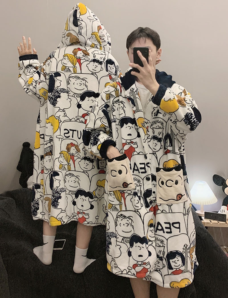 史努比睡衣女秋冬季法兰绒加绒加厚情侣睡袍中长款珊瑚绒男士浴袍