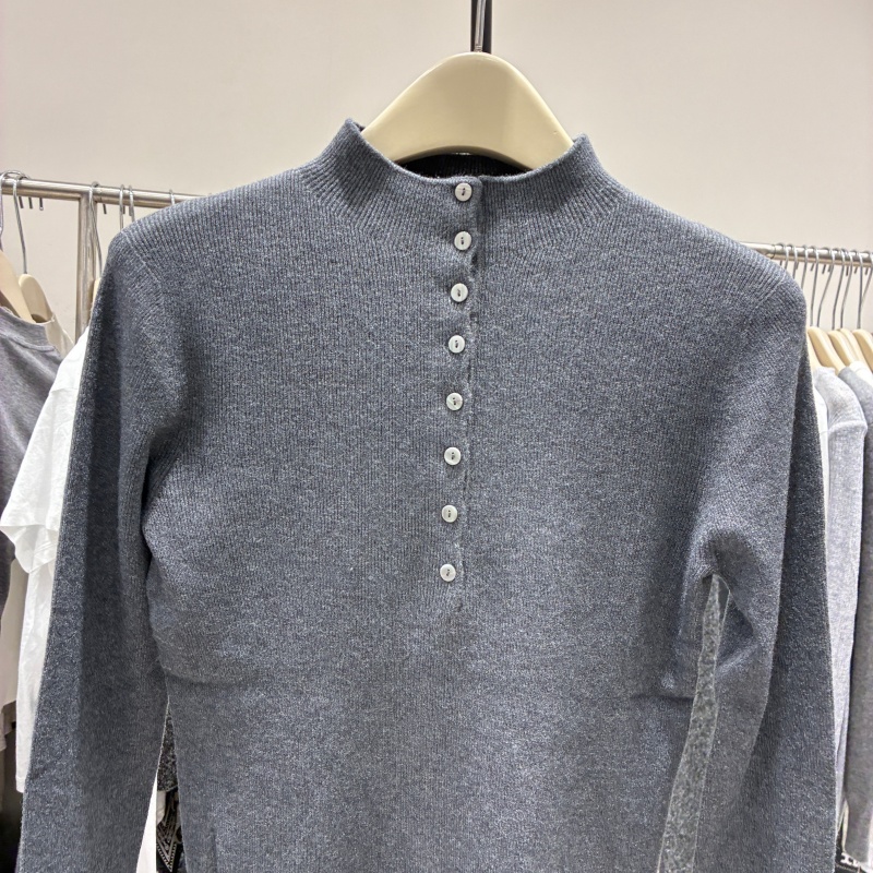2025秋新款百搭显瘦半高领纽扣长袖绵羊绒针织衫女修身打底毛衣潮