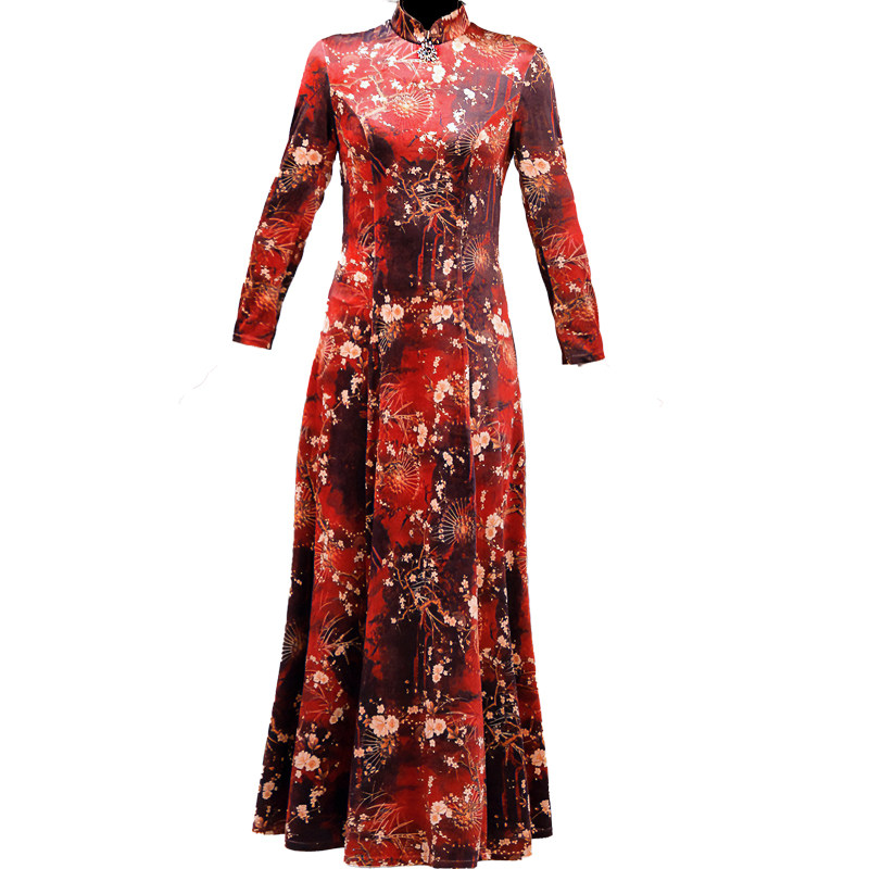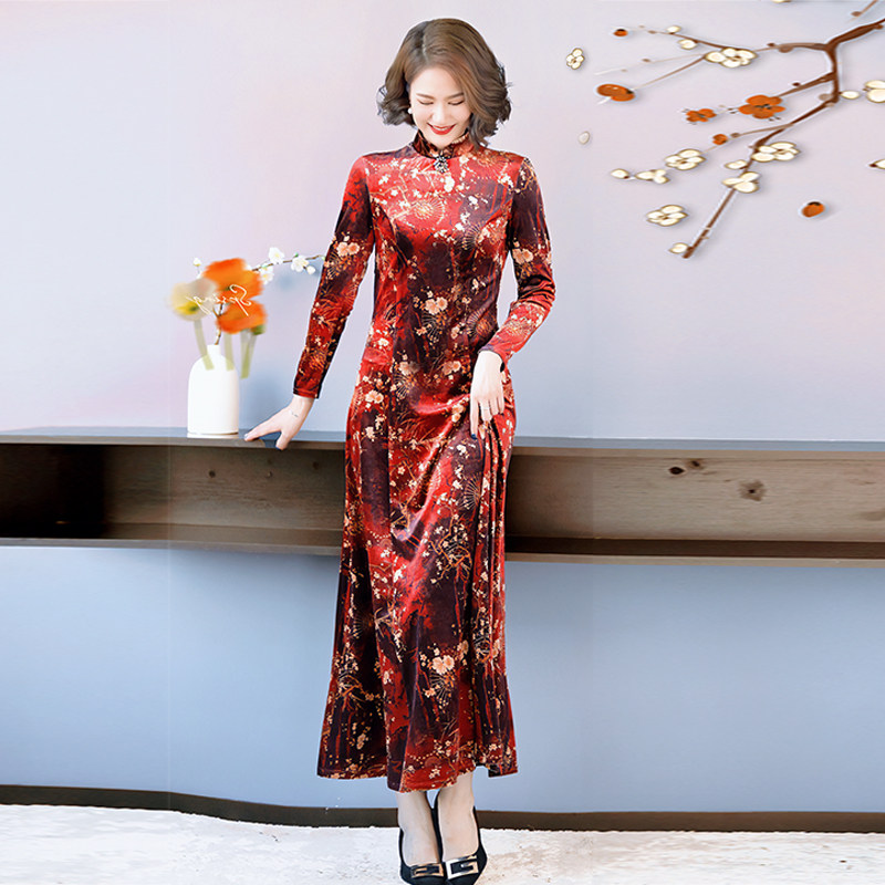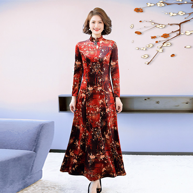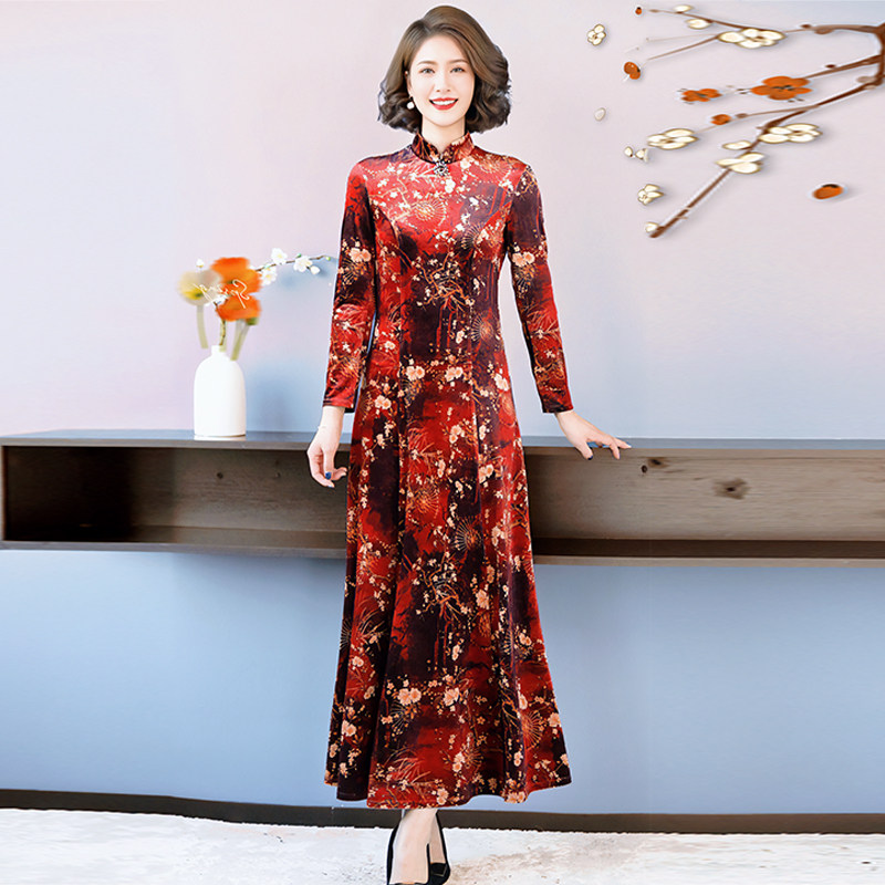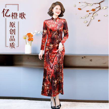 金丝绒加绒厚连衣裙中老年秋冬装大码遮肚小个子中长款婚宴礼服裙