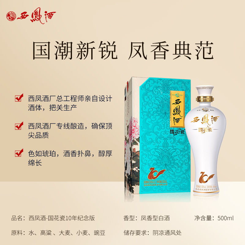 送礼酒 52度西凤酒国花瓷10年纪念版凤香型粮食白酒礼盒装2瓶
