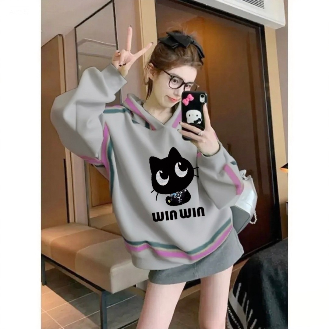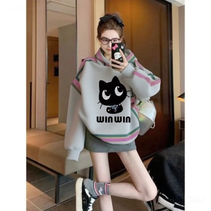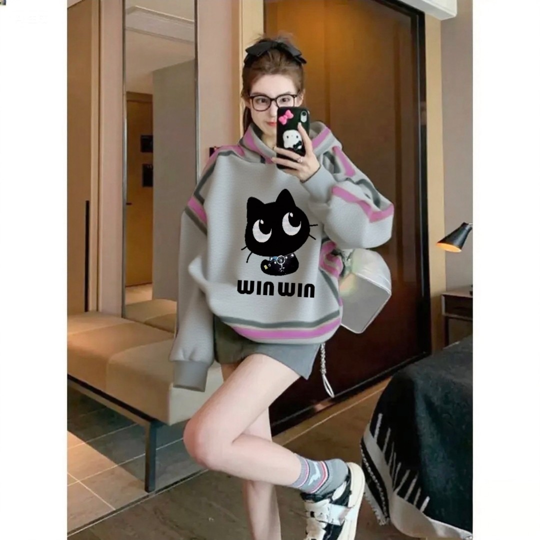 灰色小猫印花连帽卫衣女韩版宽松显瘦冬季加绒加厚保暖套头外套女