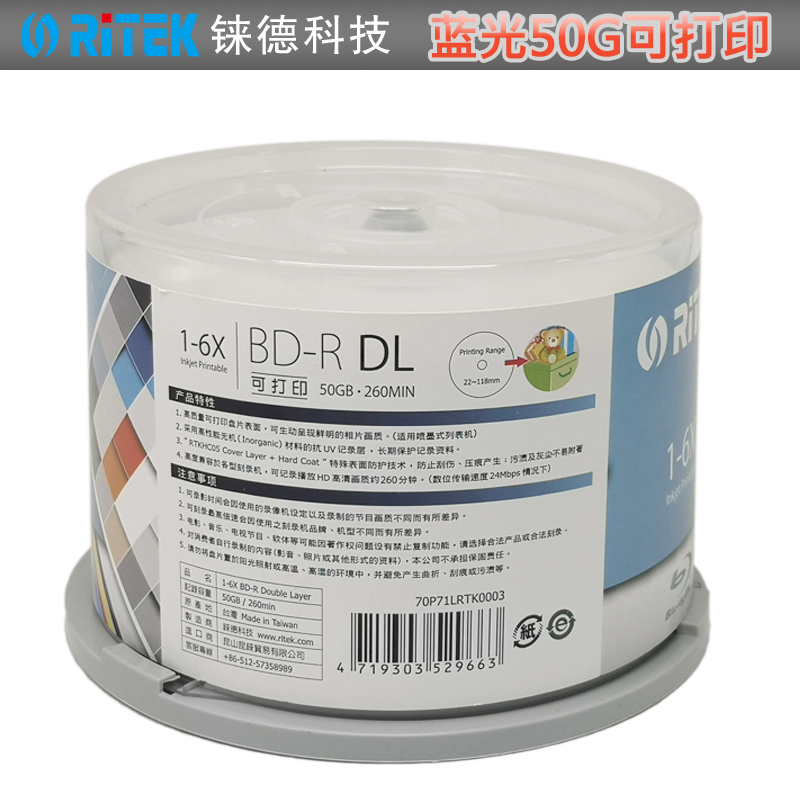 铼德(RITEK) 蓝光可打印 BD-R 1-6/1-8速50G 空白光盘/光碟/刻录