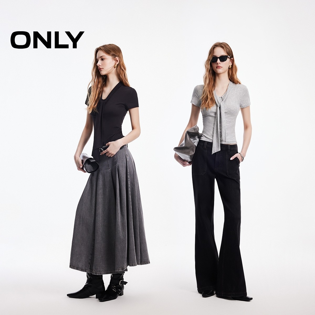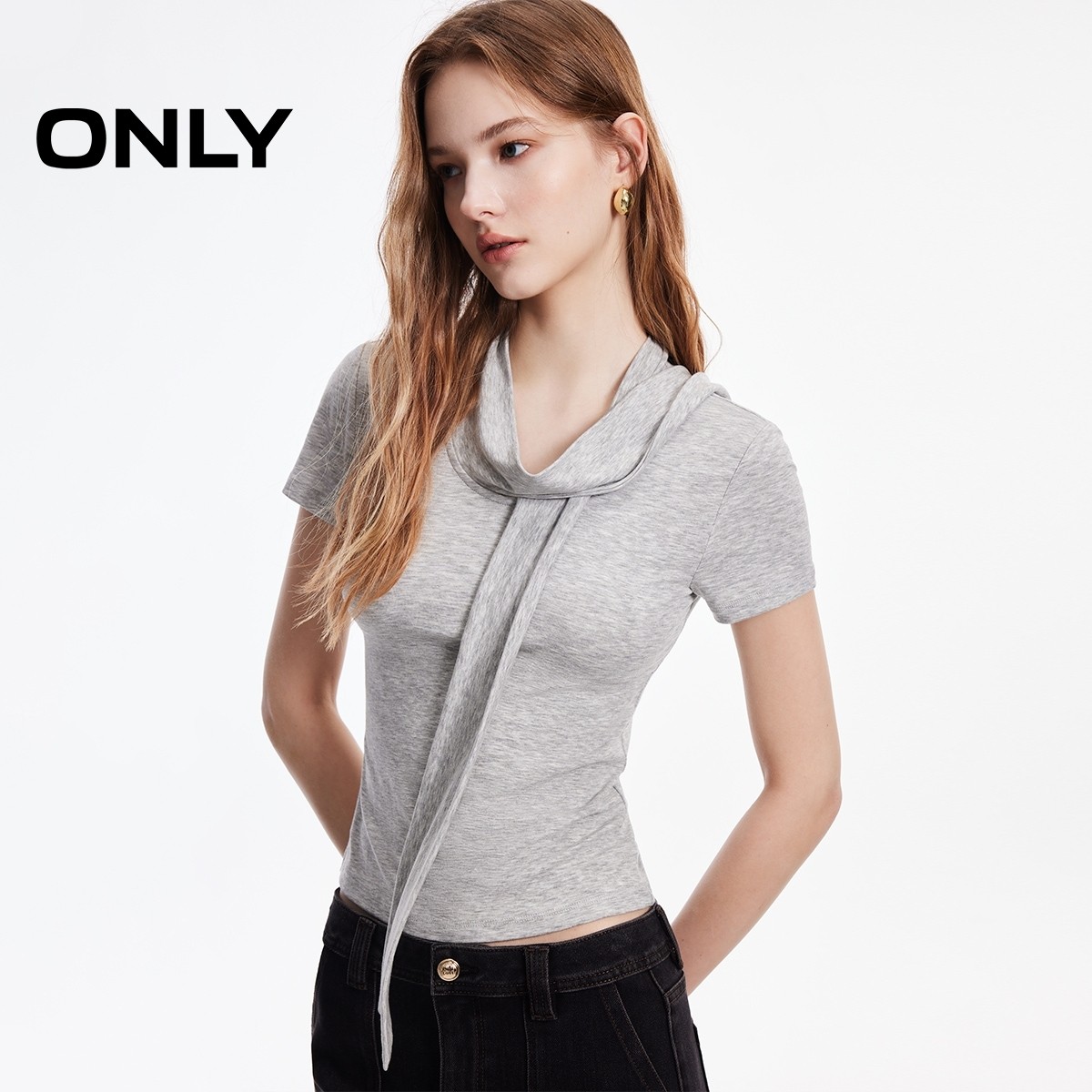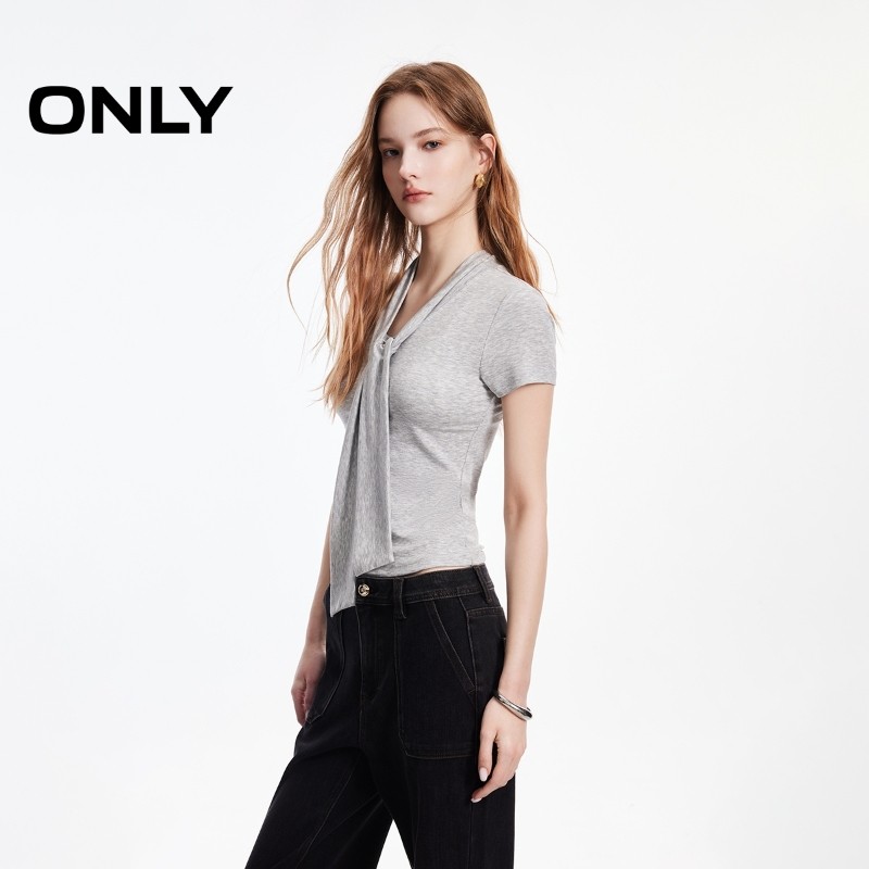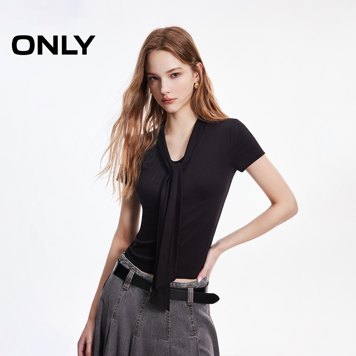ONLY2026春季新款都市设计感系带V领海军风航海纯色修身短袖T恤女