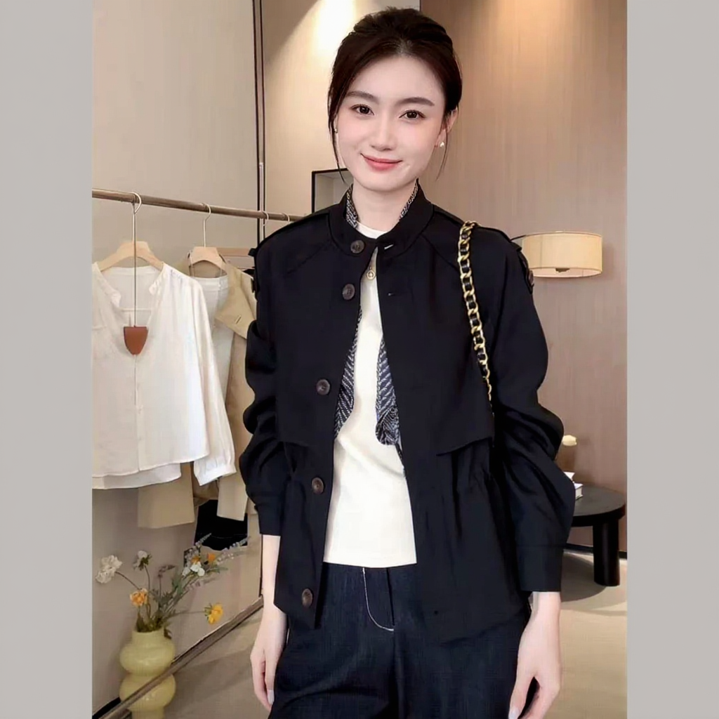 复古单排扣小立领夹克女黑色外套春秋款可调节收腰抽绳显瘦短风衣