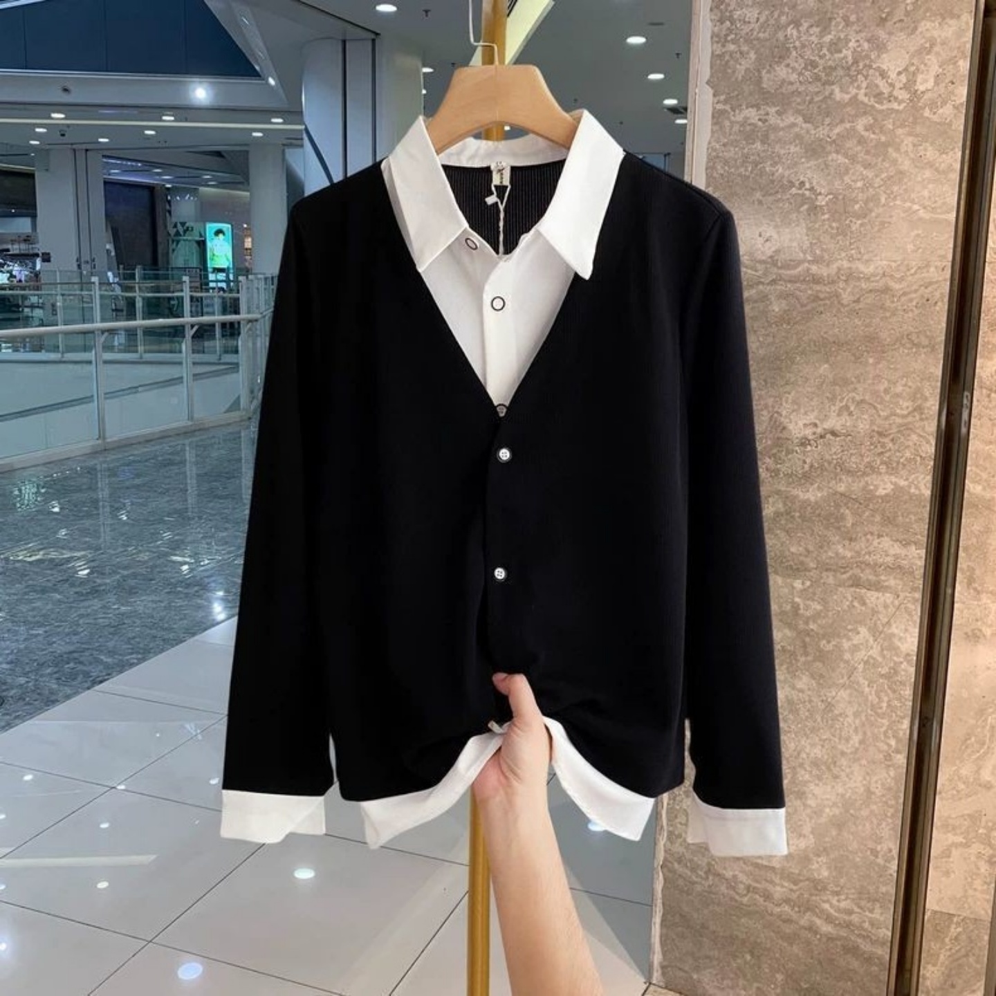 胖MM300斤小众款衬衫POLO领假两件拼接遮肚显瘦长袖上衣超大码女
